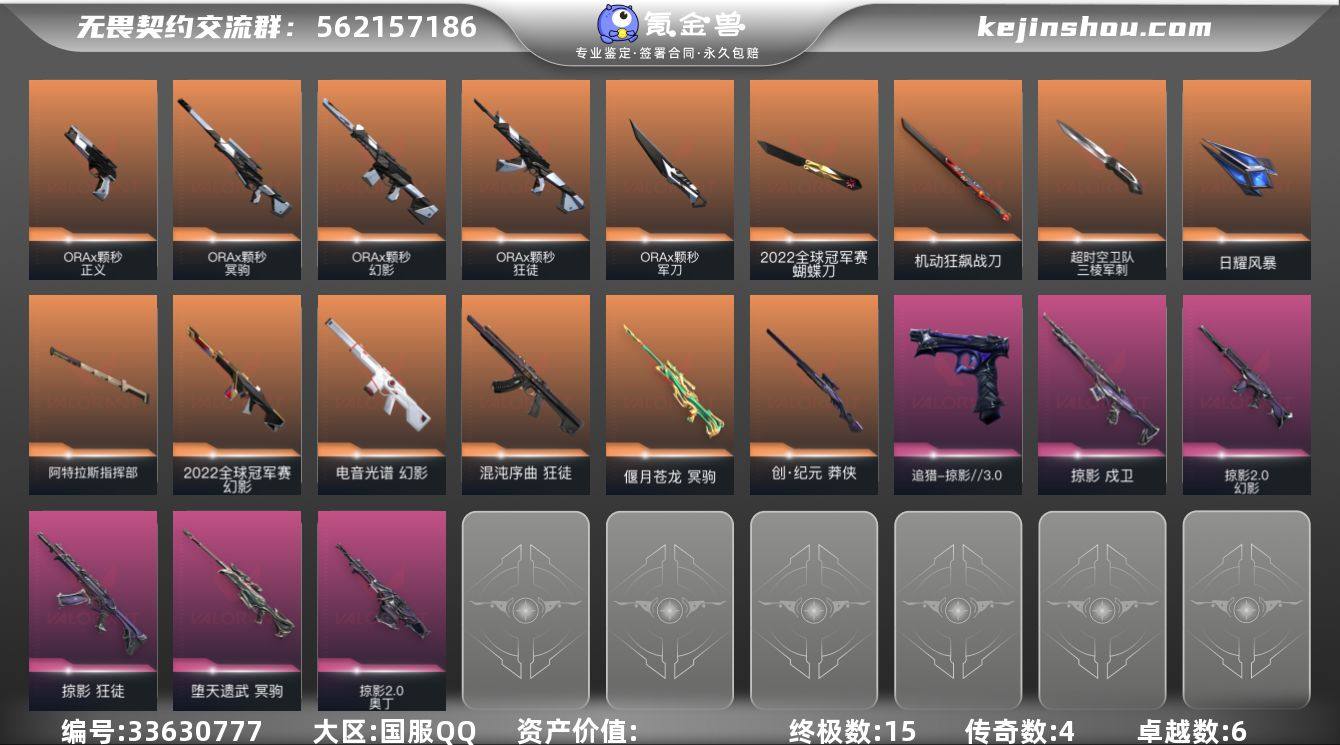 【4.4万资产.22套.颗秒套.掠影套.三棱军刺.机动狂飙战刀.碎心裂刃.混沌.偃月苍龙.】YXy6619【可二次】[因赛季更新游戏段付以上号为准] 【套装】:2022全球冠军赛套装,ORA x 颗秒套装,回火礼包:掠影套装,掠影//3.0套装 【英雄】:幻棱,炼狱,维斯,暮蝶,壹决,铁臂,捷风,雷兹,幽影,不死鸟,贤者,猎枭,蝰蛇,零,芮娜,奇乐,尚勃勒,霓虹,斯凯,夜露,星礈,K/O,盖可,黑梦,钢锁 【近战武器】:近战武器-2022全球冠军赛 蝴蝶刀,近战武器-碎心裂刃,近战武器-影蝶,近战武器-ORA x 颗秒 军刀,近战武器-影钩,近战武器-超时空卫队 三棱军刺,近战武器-机动狂飙 战刀,近战武器-日耀风暴 遗器,近战武器-阿特拉斯指挥部 甩棍 【狂徒】:狂徒-混沌序曲,狂徒-ORA x 颗秒,狂徒-掠影 【幻影】:幻影-2022全球冠军赛,幻影-电音光谱,幻影-ORA x 颗秒,幻影-掠影//2.0,幻影-电音光谱 【戍卫】:戍卫-掠影 【冥驹】:冥驹-偃月苍龙,冥驹-ORA x 颗秒,冥驹-堕天遗武 【莽侠】:莽侠-创·纪元 【奥丁】:奥丁-掠影//2.0 【追猎】:追猎-掠影//3.0 【正义】:正义-ORA x 颗秒 【卡面】:分崩离析 卡面,精灵大战 卡面,树懒大作战 卡面,无畏契约GO!第一卷:芮娜 卡面...