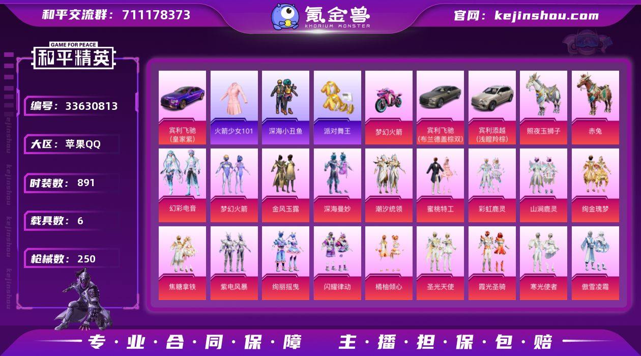 苹果手Q-9王牌印记-44粉装-7特效枪-6载具-热力值-251套装-250枪皮 【44粉装】套装-憨憨奶龙,套装-山涧鹿灵,套装-彩装战姬,套装-金风玉露,套装-深海曼妙,套装-圣光天使,套装-霞光圣骑,套装-冰川红玫,套装-蜜桃特工,套装-寒光使者,角色-呆萌星弥,套装-碧蓝澄空,套装-紫电风暴,套装-第五大道,套装-闲梦青缨,套装-苔丝玫瑰,套装-暗夜玫瑰,套装-炫光之旅,套装-闪耀律动,套装-萌物绒绒,套装-绚丽摇曳,套装-冰川幽秘,套装-橘柚倾心,套装-梦幻火箭,套装-莲影清波,角色-白勺歌姬,套装-绚金瑰梦,角色-万古烈焰,套装-瑰丽时代,套装-傲傲奶龙,套装-镜光幻境,套装-拂晓神骑,套装-启明星,套装-天星战神,套装-幻彩电音,套装-南国舞曲,套装-彩虹鹿灵,角色-小可学妹,套装-焦糖拿铁,套装-霁雪冰心,套装-玉鳞金羽,套装-傲雪凌霜,套装-潮汐统领,角色-星云暗核 【7特效枪】UMP45-量子极限/5级,AKM-绿萝繁花/5级,DP-28-豹影疾电/2级,Kar98K-巳巳如意/5级,Kar98K-未来歌姬/6级,MK12-雪月幻音/3级,PKM-守护天翼/5级 【8稀有紫装】火箭少女101,派对舞王,2P战斗服款,2B战斗服款,深海小丑鱼,迅捷狂鲨,龟仙人,暗夜魅影 【6稀有载具】宾利飞驰(皇家紫)/3级,宾利飞驰(布罗德盖棕双色),宾利添越(浅瞪羚棕),赤...