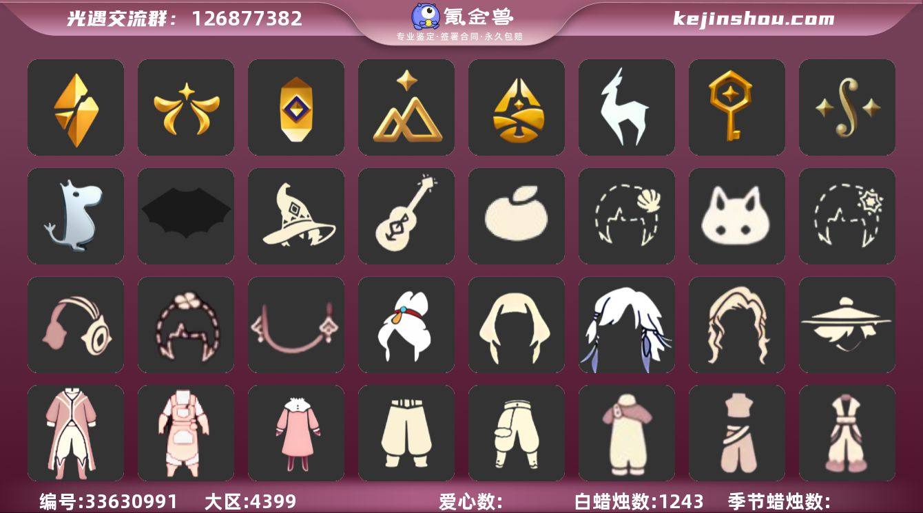 [18920640]VIVO 手机账号 2珍稀物品 9毕业季 4毕业图 1243蜡烛 【珍稀物品】透明蝶翼斗,彩虹围巾(五塑彩带斗) 【季节已毕业】破晓季,欧若拉季(欧若拉),追忆季,拾光季,归巢季,九色鹿(九色鹿季),筑巢季,二重奏季,姆明季 【完成地图】晨岛,雨林,霞谷,墓土(暮土) 【礼包】巫师(巫师帽),橘子(大橘大利),雪花(雪花发夹),贝壳(贝壳发饰),兔子(玉兔头饰)(玉兔发饰)(兔子发饰),四叶草(四叶草头饰),新年耳钉(金鳞耳饰),彩虹耳机,蝙蝠套(蝙蝠斗篷)(南瓜头),青衫落拓礼包,吉他(音韵吉他)(白吉他),南瓜(冥龙南瓜) 【裤子】筑巢季·裤子(设计师长袍),青鸟尊贵蓬头裤子(蓝色燕尾服),飞天裤(柔缎花边连)(九色鹿丝带裤),妮妮裙子(妮妮长裙),蓝绿裤(高领舞服),武士裤,背带裤,搓澡巾 【面具】黄眉企鹅面具,夜行毕业面具(棕熊面具) 【面饰】黑框眼镜(粗框眼镜),红耳机 【项链】围巾(肩带) 【发型】留辫蘑菇头,飞天盘发(九色鹿丸子头),虚荣,归巢毕业发型(五塑彩羽发),若笠(箬笠) 【头饰】平顶帽,牛仔帽(西部帽) 【斗篷】冥龙斗篷,燕尾斗篷,遥鲲斗篷(双翼遥鲲斗),黄色蓑衣(道袍),绿芽,海洋斗 【配饰】鲲灯(追忆之书),相机(季卡相机),小红伞(姆明红伞)(姆明大伞),姆明抱枕,二重奏挂画(合奏挂画),雨伞,...