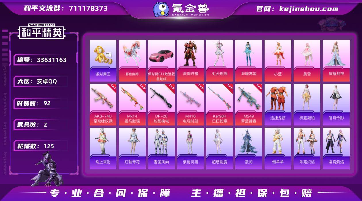 金鞋 满级地铁安卓 手Q-6粉装-6特效枪-2载具-6粉色飞行器-42623热力值-7王牌印记-92套装-125枪皮 【热门品类】:套装-派对舞王,套装-龟仙人 【粉色套装】:角色-小蓝,角色-美雪,角色-智耀战神,角色-异瞳寒姬,角色-虹云熊熊,角色-虎痴许褚 【粉色枪皮等级】:M416-电玩时刻(五级),AKS-74U-星穹咏叹调(七级),Kar98K-巳巳如意(五级),Mk14-福马献瑞(五级),M249-霁蓝缠春(四级),DP-28-豹影疾电(五级) 【粉色载具】:保时捷911 敞篷版(星珀红),暮色幽蹄 【粉色枪皮】:M416-电玩时刻,AKS-74U-星穹咏叹调,Kar98K-巳巳如意,Mk14-福马献瑞,M249-霁蓝缠春,DP-28-豹影疾电 【粉色飞行器】:炫彩糖果飞行器,鎏金朋克飞行器,英伦信使飞行器,灵珠游龙飞行器,极意拳锋飞行器,暮色之舞飞行器 【粉色降落伞】:绝对恒星降落伞,龙虾霸霸降落伞,第五大道降落伞,仲夏莫吉托降落伞,江南烟雨降落伞,临安公主降落伞,绯穹魔姬降落伞,异瞳寒姬降落伞,炫彩糖果降落伞,辉云木星降落伞,虹云熊熊降落伞 【稀有套装】:套装-龟仙人,套装-巳巳如意,角色-超感刻度,套装-雪国风尚,套装-炫彩糖果,套装-马上来财,套装-迅捷龙虾,套装-糖糖葫芦,套装-青团波波,角色-摩登...