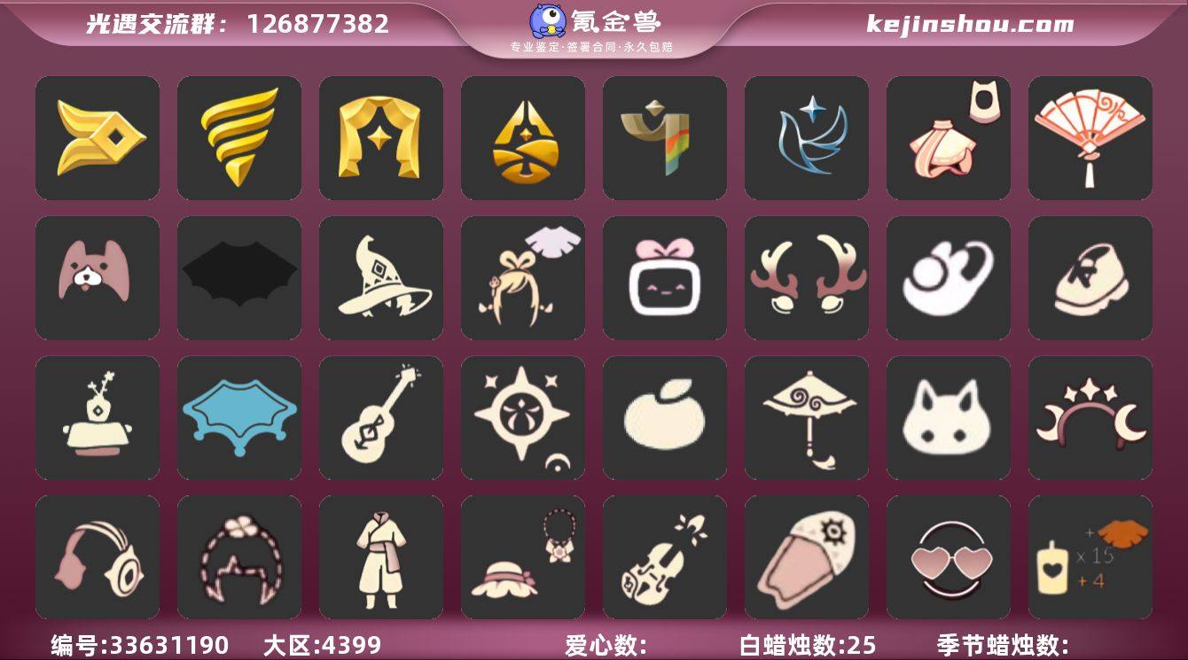 [18920725]哔哩哔哩 手机账号 2珍稀物品 8毕业季 6毕业图 25蜡烛 【珍稀物品】白枭(帝企鹅发),彩虹围巾(五塑彩带斗) 【季节已毕业】风行季,潜海季,表演季,归巢季,彩染季,青鸟季,双星季,迁徙季 【完成地图】晨岛,云野,雨林,霞谷,墓土(暮土),禁阁 【礼包】兔子鞋(兔子拖鞋),运动鞋(跃动跑鞋),暗彩装扮(彩虹武士裤),爱心眼镜,周年影院套餐礼包,姆明饰品套装(姆明尾巴),向日葵套(夏日有友礼包),巫师(巫师帽),绊爱(绊爱斗篷)(绊爱礼包),橘子(大橘大利),小狗周年发饰(小狗周年头饰),锦标赛桂冠,兔子(玉兔头饰)(玉兔发饰)(兔子发饰),四叶草(四叶草头饰),星月头饰(星月头冠),彩虹耳机,日光耳环,满月耳坠,鹿角(圣诞鹿角),云音伴游耳机,创始人(创始人斗篷),蝙蝠套(蝙蝠斗篷)(南瓜头),瑞雪(瑞雪斗篷)(暖冬瑞雪),风之旅人白袍(超凡风之旅人礼包),青衫落拓礼包,吉他(音韵吉他)(白吉他),人声乐器(欧若拉之声),小提琴(凯旋提琴),红伞(瑞气纸伞),献瑞折扇礼包,茶桌(花憩茶桌),滑板(冲浪滑板)(冲浪板),大铁头 【裤子】武士裤,搓澡巾 【面具】黄眉企鹅面具,呼吸面具(潜水面具),辉光羚羊面具 【面饰】青鸟毕业面饰(青鸟面饰),红耳机 【发型】单侧绑发(单边小辫),虚荣,归巢毕业发型(五塑彩羽发),...