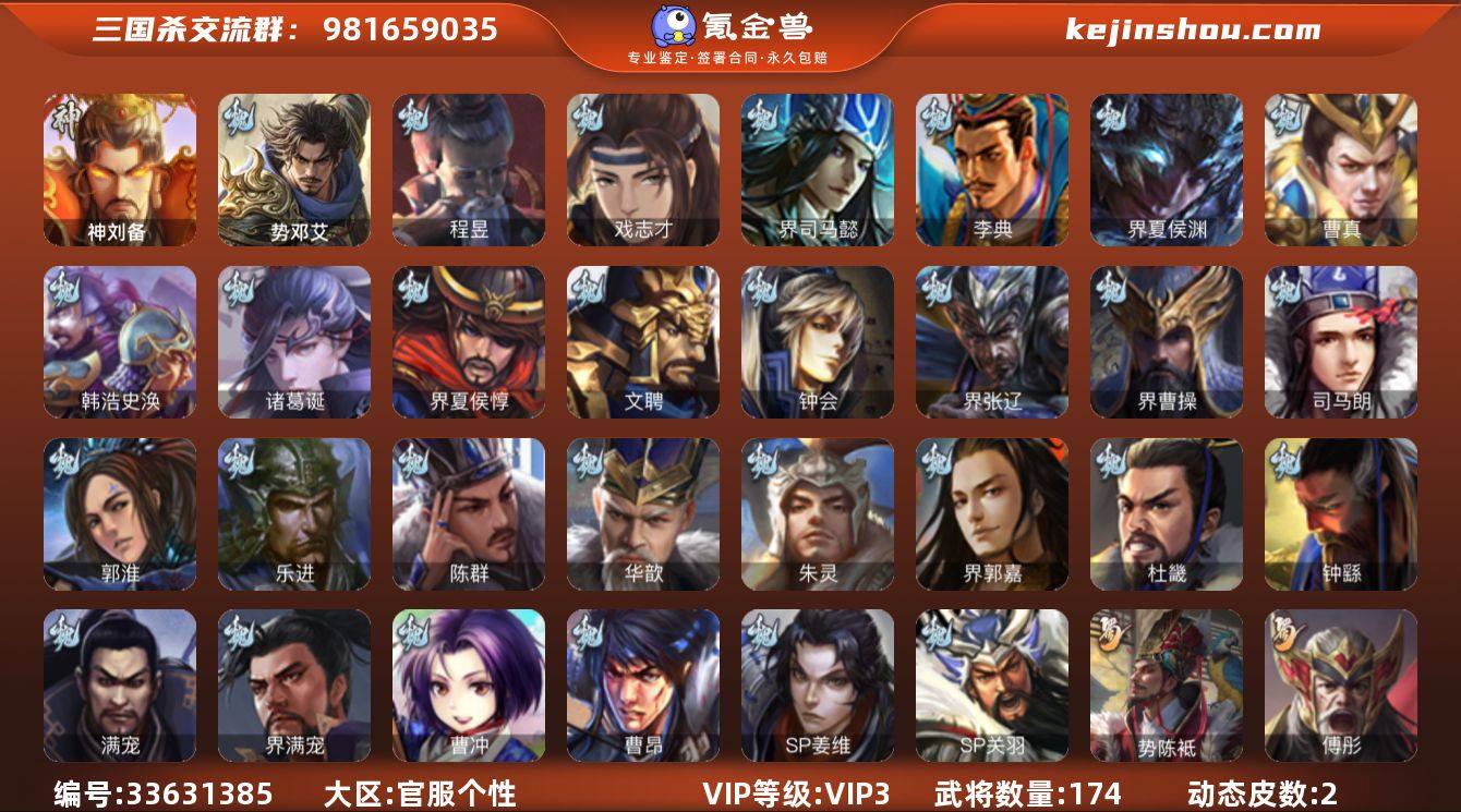 【JYSGS274】官阶:中军将军 VIP等级:VIP3级 史诗武将数:5 动态皮肤数:2 武将总数:174 史诗宝珠数:4 元宝数:890 将魂数:1012 /神刘备/势邓艾/程昱/戏志才/界徐盛/华歆/界曹操/界司马懿/界夏侯惇/界张辽/界郭嘉/界夏侯渊/钟会/曹冲/郭淮/满宠/曹真/韩浩史涣/陈群/钟繇/界满宠/诸葛诞/曹昂/SP关羽/SP姜维/文聘/乐进/司马朗/李典/杜畿/朱灵/华雄/袁术/谋贾诩/界华佗/界袁术/界庞德/公孙瓒/伏皇后/李儒/蔡夫人/界公孙瓒/界刘表/伏完/张宝/董白/SP太史慈/王濬/势陈祗/界刘备/界赵云/界马超/关兴张苞/廖化/关平/简雍/刘封/吴懿/周仓/张松/界关兴张苞/界马岱/界简雍/马良/夏侯霸/SP孙尚香/关银屏/SP徐庶/马忠/傅肜/邓芝/诸葛果/孙亮/吕范/界甘宁/界吕蒙/界黄盖/界周瑜/界大乔/界陆逊/程普/韩当/潘璋马忠/虞翻/朱然/孙鲁班/朱桓/顾雍/孙休/朱治/全琮/界孙休/诸葛瑾/孙鲁育/诸葛恪/吕岱/张布/戏志才-举棋若定(动态)/邓艾-神兵天降(动态)/鲁肃-蛇年端午(动态)/陶谦-安民护祚(动态)