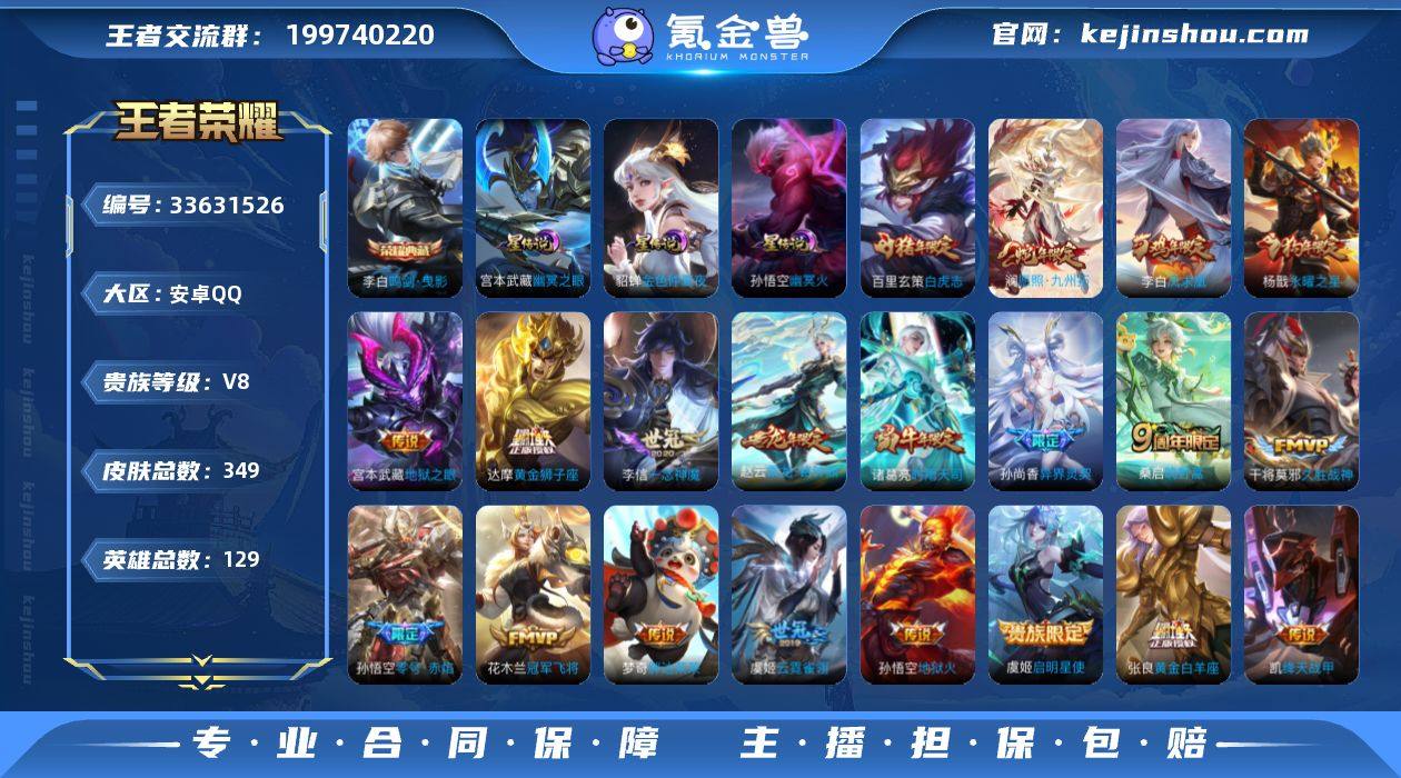 王者21090,夺宝285,金标干将莫邪,6748,安卓Q-V8-至尊星耀V段位-129英雄-349皮肤-1典藏皮肤-20传说-103史诗 【英雄全皮】:猪八戒全皮 【荣耀典藏】:李白鸣剑曳影 【传说皮肤】:澜愿照九州拓,桑启鸣野蒿,赵云乘龙铭钟鼎,孙尚香异界灵契,诸葛亮时雨天司,铠绛天战甲,虞姬启明星使,孙悟空零号赤焰,李信一念神魔,张良黄金白羊座,干将莫邪久胜战神,虞姬云霓雀翎,达摩黄金狮子座,百里玄策白虎志,花木兰冠军飞将,梦奇胖达荣荣,杨戬永曜之星,李白凤求凰,宫本武藏地狱之眼,孙悟空地狱火 【限定皮肤】:白起狰,姜子牙天穹之誓,杨戬破阵退雄兵,狄仁杰阴阳师,虞姬凯尔特女王,赵云皇家上将,赵云龙胆,墨子神迹守卫,嬴政优雅恋人,嬴政白昼王子,孙尚香异界灵契,鲁班七号狮舞东方,庄周高山流水,高渐离玩趣恶龙,阿轲迷踪丽影,钟无艳王者之锤,孙膑妖精王,扁鹊炼金王,芈月重明,吕布猎兽之王,周瑜赤莲之焰,元歌云间偶戏,夏侯惇朔风刀,曹操烛龙,典韦穷奇,马可波罗逐梦之星,马可波罗暗影游猎,狄仁杰魔术师,狄仁杰万华元夜,达摩星际陆战队,达摩沙漠行僧,项羽海滩派对,老夫子醍醐杖,老夫子航海奇遇记,关羽冰锋战神,程咬金演武夺筹,刘邦夺...