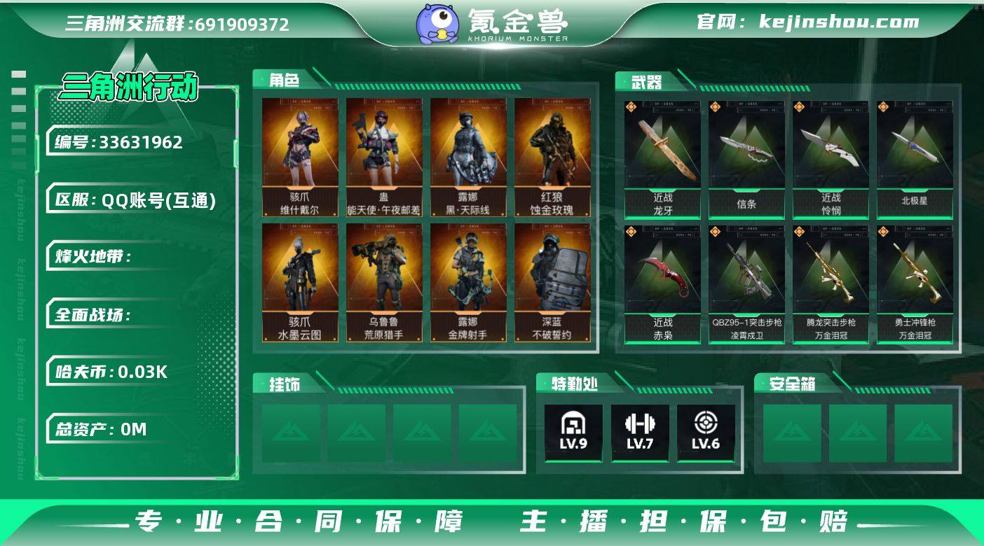 【可二次】52M 23K哈夫币 60-烽火等级 560-三角币和劵 13级通行证 20-战场等级 【近战武器】 北极星 龙牙 赤枭 怜悯 信条 黑鹰 【干员外观】 骇爪-水墨云图 露娜-黑·天际线 蛊-能天使午夜邮差 红狼-蚀金玫瑰 骇爪-维什戴尔 蜂医-送葬人·无题密令 深蓝-不破誓约 乌鲁鲁-荒原猎手 红狼-电锯惊魂 无名-夜鹰 露娜-金牌射手 【套装】 蚀金玫瑰套 水墨云图套 黑·天际线套 能天使-午夜邮差套 维什戴尔套 【典藏枪皮】 M7战斗步枪-棱镜攻势S2(优品A) AS-Val突击步枪-悬赏令(优品S) 【传说枪皮】 K437突击步枪-北极星 QCQ171冲锋枪-北极星 725双管霰弹枪-送葬人-无题密令 SCAR-H战斗步枪-水墨云图 腾龙突击步枪-捞点薯条 AWM狙击步枪-捞点薯条 93R-捞点薯条 UZI冲锋枪-特斯拉线圈 AK-12突击步枪-特斯拉线圈 SR-3M紧凑突击步枪-特斯拉线圈 M4A1突击步枪-阿米娅 R93狙击步枪-维什戴尔 SCAR-H战斗步枪-启航 M14射手步枪-蛮荒 QBZ95-1突击步枪-凌霄戍卫 M700狙击步枪-尖峰行动 腾龙突击步枪-万金泪冠 勇士冲锋枪-万金泪冠 AK-12突击步枪-夜鹰 ASh-12战斗步枪-鹅鸭杀 QJB201轻机枪-鹅鸭杀 QCQ171冲锋枪-鹅鸭杀 KC17突击步枪-电锯惊魂 P90冲锋枪-信条 SR-25射手步枪-信条 SG552突击步枪-...