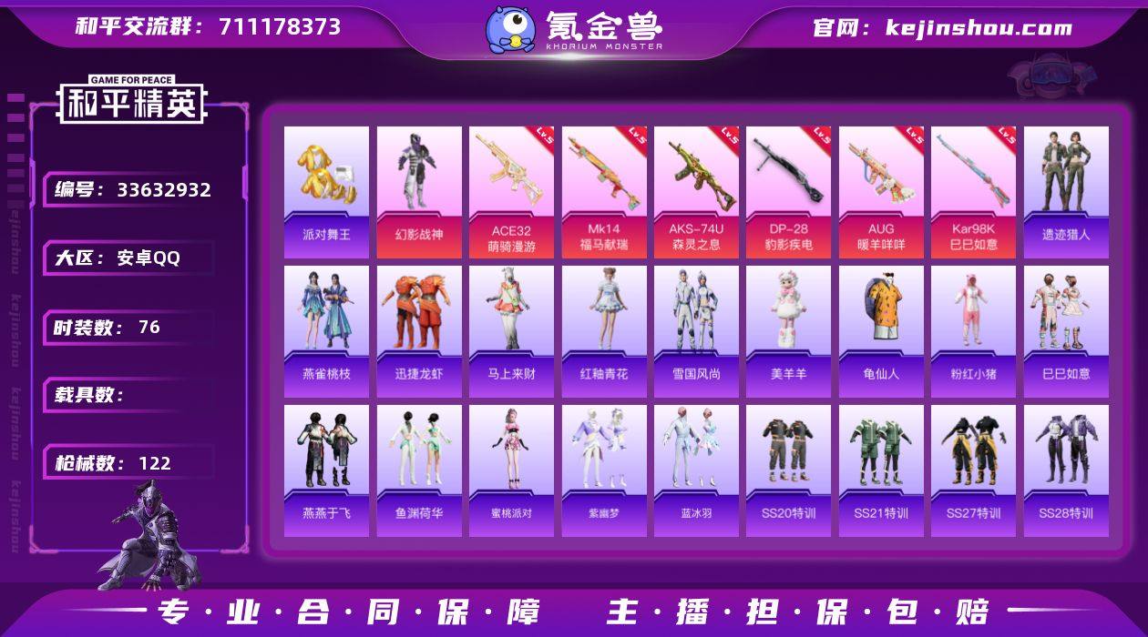 J3379 【性价比】1粉 6特 金鞋 满级枪*6 地铁满天赋 收藏家等级39 安卓 手Q-1粉装-6特效枪-0载具-1粉色飞行器-29011热力值-3王牌印记-76套装-122枪皮 【热门品类】:套装-派对舞王,套装-龟仙人,套装-粉红小猪 【粉色套装】:粉装-幻影战神 【粉色枪皮等级】:AUG-暖羊咩咩(五级),ACE32-萌骑漫游(五级),AKS-74U-森灵之息(五级),Kar98K-巳巳如意(五级),Mk14-福马献瑞(五级),DP-28-豹影疾电(五级) 【粉色枪皮】:AUG-暖羊咩咩,ACE32-萌骑漫游,AKS-74U-森灵之息,Kar98K-巳巳如意,Mk14-福马献瑞,DP-28-豹影疾电 【粉色飞行器】:炫彩糖果飞行器 【粉色降落伞】:星之彼岸降落伞,樱桃泡泡降落伞,炫彩糖果降落伞,鸢尾珑雾降落伞 【稀有套装】:套装-龟仙人,套装-巳巳如意,套装-雪国风尚,套装-炫彩糖果,套装-马上来财,套装-迅捷龙虾,套装-遗迹猎人,套装-燕燕于飞,套装-鱼渊荷华,角色-蜜桃派对,套装-紫幽梦,套装-蓝冰羽,玩偶服-美羊羊,套装-雨过天青,套装-红釉青花,套装-燕雀桃枝 【稀有枪皮】:AUG-冰晶雪宝,AKM-星之彼岸,AKM-环太平洋,AKM-破晓战魂,AKM-龙的传人,SCAR-L-夜灯,SCAR-L-炫彩节奏,SCAR-L-红色方程式,M416-红色方程式,M416-蓝色火...