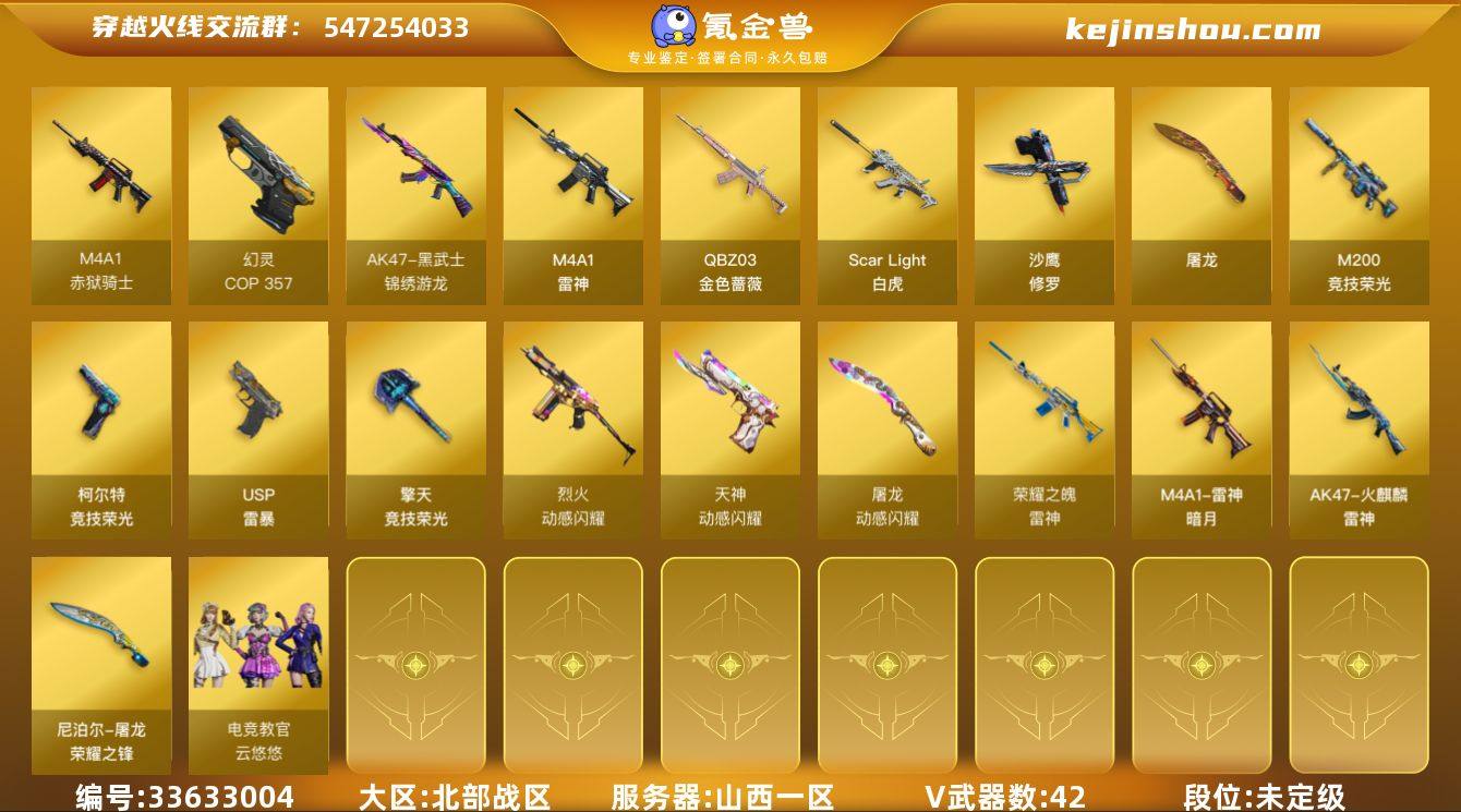 山西一区-44V-0王者武器数-0炫金武器数 【热门武器】:QBZ03-金色蔷薇,Scar Light-白虎,M200-竞技荣光,裁决-雪莉杨,USP-雷暴,COP 357-幻灵,沙鹰-修罗 【皮肤】:雷神-暗月,雷神-荣耀之魄,雷神-15周年嘉年华 皮肤,火麒麟-雷神,屠龙-荣耀之锋 【角色】:电竞教官-云悠悠,战地猎狐,乔伊教练,暗夜-X,电竞少女,芳心审判者,飞虎队-X,风暴女,嘉年华灵狐,娟娟,灵狐者-X,麻雀,曼陀罗-礼服,潘多拉-X,铁骑荣耀,维纳斯,游珑儿,潘多拉-N 【人偶武器】:裁决-雪莉杨,AWM-灵狐-15周年嘉年华,迷你裂空之翼*2,迷你巨石泰坦-魔花研究所 【暴走生化】:超级对讲机 【挑战大师】:激光毁灭者III-白马银枪 【英雄级武器】:M4A1-雷神,Scar Light-白虎,QBZ03-金色蔷薇,黑武士-锦绣游龙,烈火-动感闪耀,机械迷城-穹宇,M200-竞技荣光,沙鹰-修罗,USP-雷暴,COP 357-幻灵,柯尔特-竞技荣光,天神-动感闪耀,屠龙,擎天-竞技荣光*2,屠龙-动感闪耀,高爆手雷-竞技荣光*9,手雷-动感闪耀,闪光弹-竞技荣光*8,烟雾弹-竞技荣光*8,M4A1-赤狱骑士 【其他武器】:源·火麒麟,魂·火麒麟-百城,火麒麟-雷神,御·黑龙-龙太子*2,源·雷神,御·雷神-机甲刑天,雷神-赛博幻想...