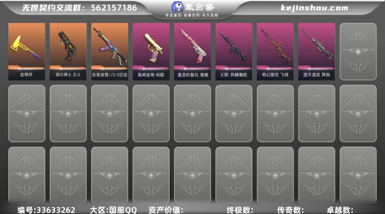 【英雄】:幻棱,炼狱,暮蝶,捷风,不死鸟,贤者,猎枭,芮娜 【近战武器】:近战武器-荆刺链刃,近战武器-金琅斧 【狂徒】:狂徒-全息波普//2.0,狂徒-离子武器//2.0,狂徒-奇幻朋克//3.0 【幻影】:幻影-末日泡泡,幻影-异鳞魔蛇 【冥驹】:冥驹-堕天遗武 【飞将】:飞将-奇幻朋克 【标配】:标配-紫阙金琅 【正义】:正义-毁灭骑士 【鬼魅】:鬼魅-盖亚的复仇 【短炮】:短炮-天才少女 【卡面】:无畏契约:蝰蛇 卡面,无畏契约GO!第一卷:芮娜 卡面,无畏契约GO!第一卷:零 卡面,钢锁vs盖可 卡面,代号红色 卡面,新兵报到 卡面,V契约 卡面,无畏契约 卡面 【喷漆】:蝰蛇 喷漆,致命毒素 喷漆,喜欢哪种毒? 喷漆,霓光四射 喷漆,买装还是存钱 喷漆,无畏契约GO!第一卷:奇乐 喷漆,放下武器 喷漆,胜利属于无畏契约 喷漆,GLHF 喷漆,无畏契约 喷漆 【挂饰】:Z世代特饮 挂饰,化学容器 挂饰,天外飞客 挂饰,无畏契约 纪念币 挂饰