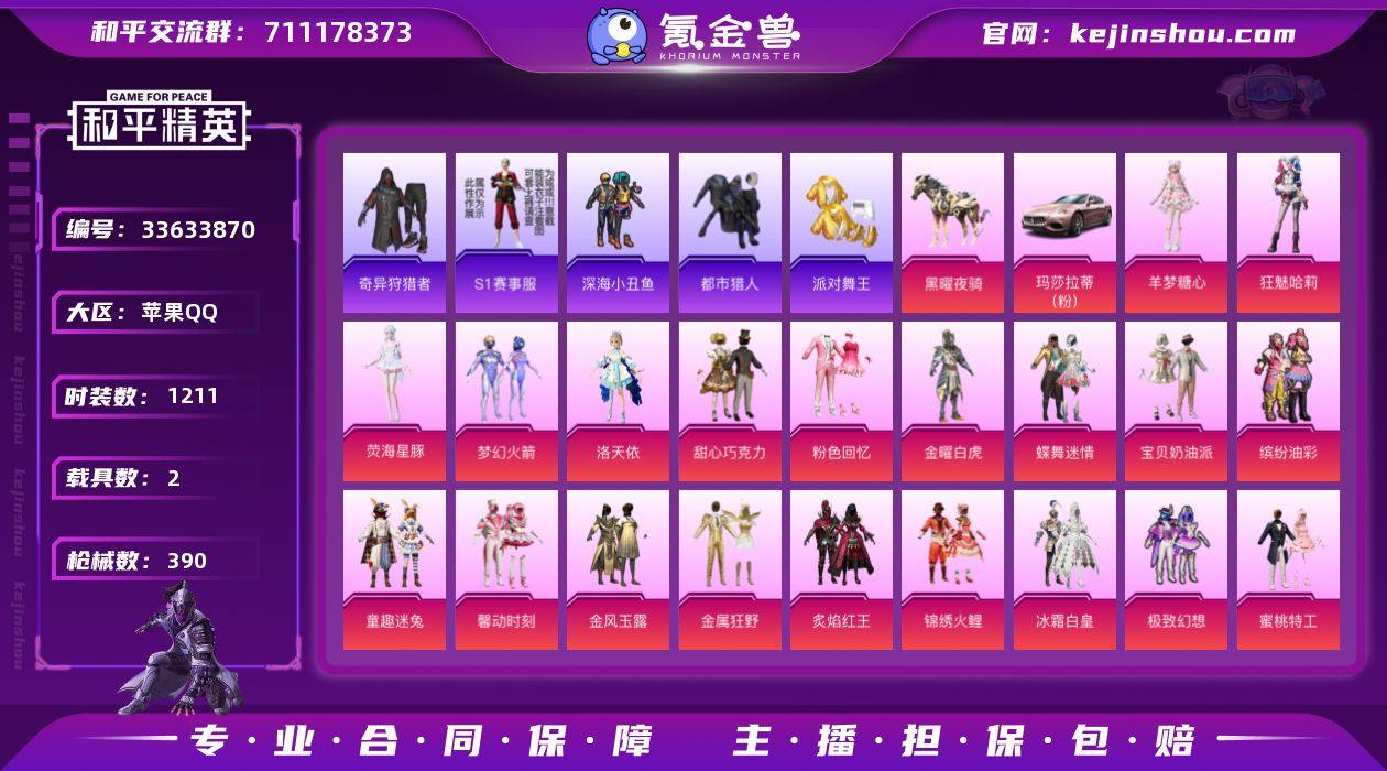 【素材身法小号/店长推荐】34粉17枪2车 都市 金鞋 巧克力 猪脸 奇异狩猎者 暗影哥特 实名: 可修改 时装数: 1211 载具数: 2 枪械数: 390 战备数: 295 热门装扮: 奇异狩猎者,梦幻火箭(新101),蝶舞迷情,甜心巧克力,呆萌铁蟹,深海小丑鱼,金风玉露,宝贝奶油派,浪漫波比,梦魇先生,万圣娃娃,迅捷狂鲨,金曜白虎,金属狂野,鹰眼刺客,缤纷油彩,爱崽白熊,好奇恐龙,粉色回忆,都市猎人,锦绣火鲤,极致幻想,炙焰红王,冰霜白皇,童趣迷兔,山涧鹿灵,馨动时刻,蜜桃特工,蝶舞蔷薇,彩虹鹿灵,洛天依,炙焰牛王,寒光使者,S1赛事上衣,霁雪冰心,彩虹甜喵,潮萌小黄鸭,大橘为重,恶魔喵喵,激萌罗小黑,奇迹天团,蔷薇魔法师,软萌银虎,神秘黑猫,纯珍童话,派对舞王,白勺歌姬,暗夜魅影,圣堂之誓,小叽联名款,蜜语绒猫,狂魅哈莉,荧海星豚,羊梦糖心 载具: 玛莎拉蒂Ghibli(粉),黑曜夜骑 稀有枪皮: MG3洛神天依,M762甜蜜誓约,AKM炫紫旋律,M416五爪金龙,M416心之恋语,UZI绮梦青鸾,SLR暗夜玫瑰,SCAR-L甜梦小狐,M249彩虹甜喵,AUG超新星,SPAS-12蜜语绒猫,Kar98K-巳巳如意,AMR-智耀战神,M416-灵猫魔法师,DP-28-豹影疾电,ACE32-萌骑漫游