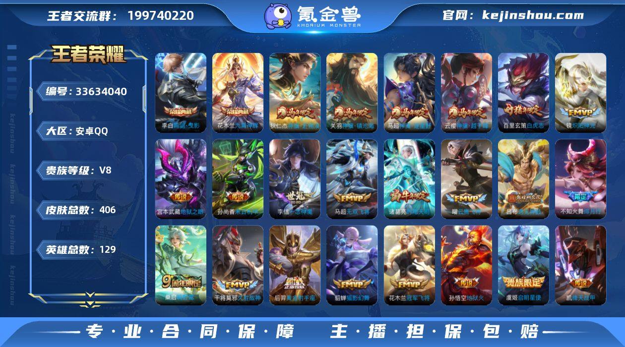 【WZZG360】贵族等级8/荣耀典藏数量2/传说皮肤数量22/史诗皮肤数量120/皮肤数量406/英雄数量129/段位至尊星耀/孙权全皮/鬼谷子全皮/苏烈全皮/狂铁全皮/敖隐全皮/戈娅全皮/空空儿全皮/影全皮/鸣剑·曳影/九霄神辉/云缨神骥越千峰/关羽神骥镇沧海/狄仁杰神骥赴朔漠/马超神骥逐星野/鸣野蒿/遇见神鼓/绯月行/无双飞将/时雨天司/绛天战甲/炽阳神光/启明星使/云鹰飞将/一念神魔/猫影幻舞/久胜战神/白虎志/冠军飞将/黄金射手座/末日机甲-孙尚香/地狱之眼/地狱火/狰(s8)/虞姬夏日便利店/天穹之誓(s36)/阴阳师/皇家上将/百木心枪/蔷薇恋人/死亡摇滚/玩趣恶龙/迷踪丽影/超时空战士-钟无艳/奇幻香踪/夜都怪侠/幻夜卜梦/赤莲之焰/云间偶戏/无心/朔风刀(s17)/匿光决锋者/游园惊梦/落雪兰心/烛龙(s10)/天狼征服者/穷奇(s12)/岱宗/暗影游猎/山海·玄木吟/魔术师/万华元夜(s22)/星际陆战队-达摩/沙漠行僧(s26)/海滩派对/醍醐杖(s20)/演武夺筹(s23)/夺宝奇兵/飞衡/午后时光/驯魔猎人/金庭之子(s27)/青春决赛季/默契交锋-花木兰/潮玩骑士王/孙行者/圣弓游侠/百相守梦(刘备)/匿光侦查者/云中旅人(s29)/驱傩正仪(s24)/遇见飞天/潮玩骑兵/真爱魔法/单词大作战/黎明之约/繁星吟游/华丽摇滚/原初探秘者(...