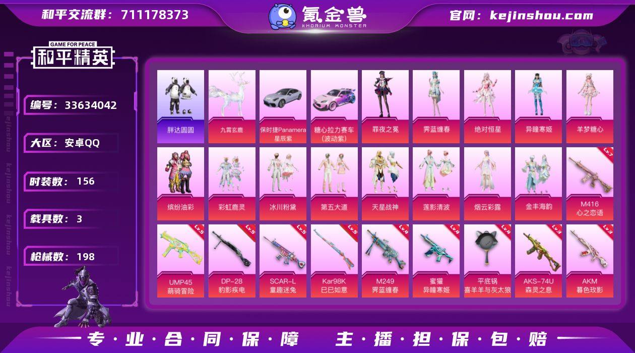 J3383 【精品大衣橱】13粉 14特 3载 红熊茄茄 胖达圆圆 羊梦糖心 缤纷油彩 烟云彩霞 霁蓝缠春 罪夜之冕 异瞳寒姬 恒星 第五大道 满级枪*4 收藏家等级71 安卓 手Q-13粉装-14特效枪-3载具-7粉色飞行器-70683热力值-5王牌印记-156套装-198枪皮 【热门品类】:粉装-缤纷油彩,套装-胖达圆圆,套装-龟仙人,套装-红熊茄茄 【粉色套装】:角色-绝对恒星,粉装-缤纷油彩,粉装-彩虹鹿灵,粉装-冰川粉黛,粉装-第五大道,粉装-天星战神,粉装-莲影清波,角色-烟云彩露,粉装-金丰海韵,角色-羊梦糖心,角色-异瞳寒姬,角色-霁蓝缠春,角色-罪夜之冕 【粉色枪皮等级】:AKM-暮色玫影(三级),SCAR-L-童趣迷兔(五级),M416-心之恋语(七级),AUG-罪夜之冕(一级),蜜獾-异瞳寒姬(四级),UMP45-萌骑冒险(五级),AKS-74U-森灵之息(三级),Kar98K-巳巳如意(五级),Mk14-福马献瑞(一级),M249-绝对恒星(三级),M249-霁蓝缠春(四级),DP-28-圣堂之誓(三级),DP-28-豹影疾电(五级),平底锅-喜羊羊与灰太狼(四级) 【粉色载具】:保时捷Panamera(星辰紫),糖心拉力赛车(波动紫),九霄玄鹿 【粉色枪皮】:AKM-暮色玫影,SCAR-L-童趣迷兔,M416-心之恋语,AUG-罪夜之冕,蜜獾-异瞳寒姬,UMP45-萌...