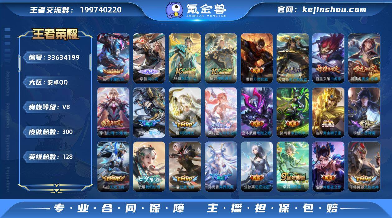 安卓Q-V8-至尊星耀IV段位-128英雄-300皮肤-1典藏皮肤-1无双-38传说-78史诗 【英雄全皮】:孙权全皮,李信全皮,莱西奥全皮 【荣耀典藏】:吕布千魇归渊 【无双皮肤】:李信问心剑 【传说皮肤】:杨戬纵目迁山,后羿神树通天,曹操万灵伏威,大司命死亡执政官,桑启鸣野蒿,夏侯惇霜北刀,朵莉亚心动手记,兰陵王影龙天霄,宫本武藏惊梅引,云缨鹤归松栖,澜电玩雷克斯,公孙离记忆之芯,虞姬无限倾心,孙悟空齐天大圣,李信山海炽霜斩,吕布怒海麟威,李白诗剑行,马超无双飞将,孙策末日机甲,裴擒虎寅虎赤拳,鲁班七号寅虎瑞焰,孙尚香异界灵契,赵云淬星耀世,李元芳飞鸢探春,铠绛天战甲,镜炽阳神光,虞姬启明星使,孙悟空零号赤焰,曜云鹰飞将,李信一念神魔,干将莫邪久胜战神,达摩黄金狮子座,百里玄策白虎志,貂蝉仲夏夜之梦,孙尚香末日机甲,宫本武藏地狱之眼,孙悟空地狱火,狄仁杰超时空战士 【限定皮肤】:夏侯惇霜北刀,暃埋骨钱,姜子牙天穹之誓,狄仁杰阴阳师,赵云皇家上将,赵云龙胆,孙尚香蔷薇恋人,孙尚香异界灵契,鲁班七号寅虎瑞焰,阿轲迷踪丽影,钟无艳超时空战士,扁鹊奇幻香踪,白起夜都怪侠,芈月幻夜卜梦,元歌无心,甄姬落雪兰心,马可波罗山...