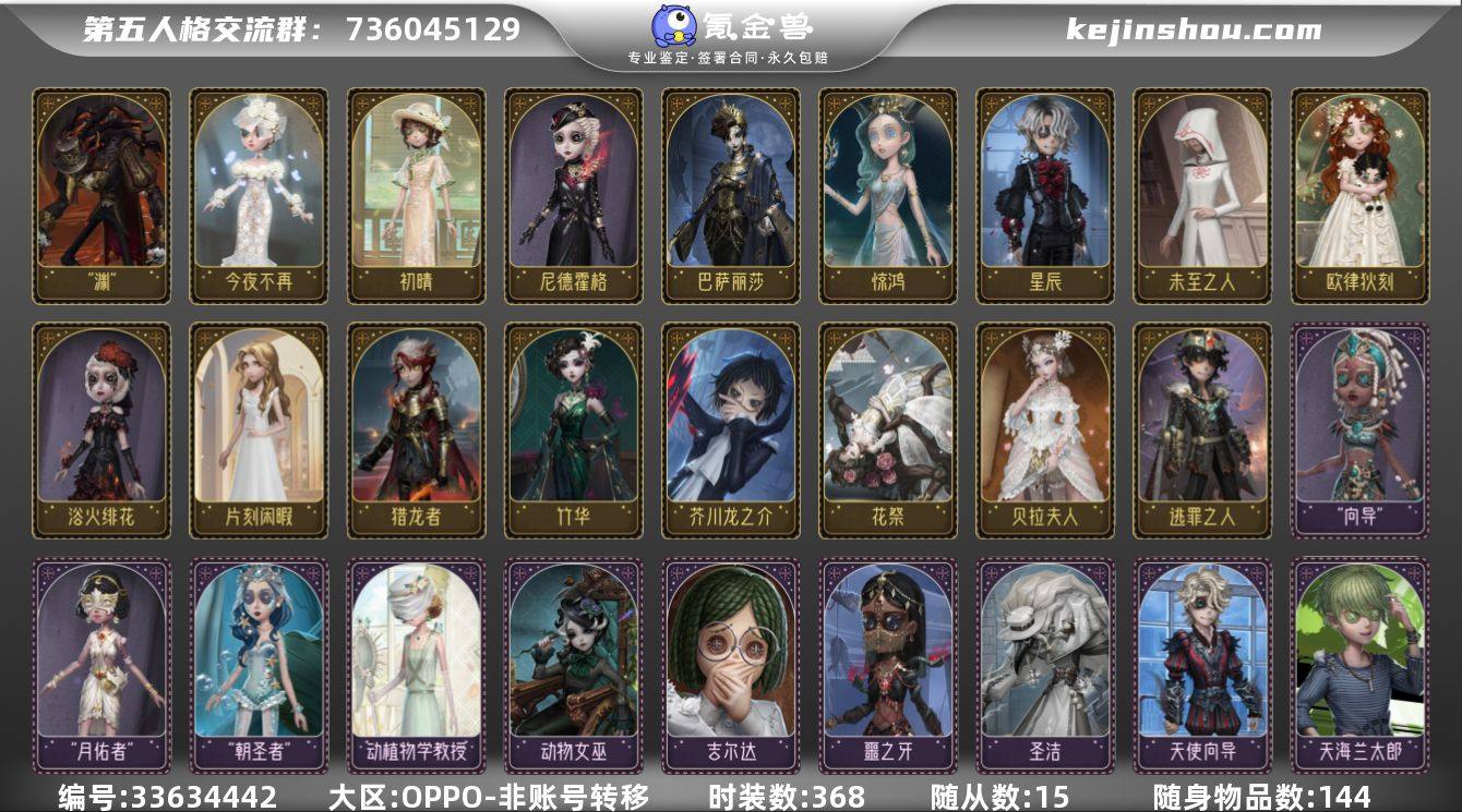 账号类型: 手机账号 时装数: 368 时装: 26号守卫-蛋壳先生,病患-逃罪之人,病患-星辰,大副-海盗电台,雕刻家-动物女巫,“噩梦”-“渊”,红蝶-彼岸,红蝶-罗生门,红蝶-竹华,红夫人-贝拉夫人,画家-江户川乱步,“杰克”-白纹大触,机械师-诡笑症,机械师-归来者,祭司-“朝圣者”,祭司-惊鸿,击球手-迫降专家,空军-尼德霍格,昆虫学者-曼陀罗,昆虫学者-动植物学教授,律师-白兔先生,鹿头-阿努比斯,蜡像师-淋浴,盲女-吉尔达,盲女-海女巫,梦之女巫-羽蛇,入殓师-守钟人,宿伞之魂-阴阳司公,摄影师-月下绅士,摄影师-暮剑,守墓人-奶酪,调香师-致命温柔,调香师-今夜不再,调酒师-黑玫瑰,舞女-“月佑者”,先知-独行者,先知-芥川龙之介,医生-炽天使,医生-往昔,医生-浴火绯花,园丁-等风来,佣兵-思明,佣兵-白鹰之舞,蜘蛛-花祭,咒术师-“向导”,咒术师-噩之牙,作曲家-猎龙者,摄影师-安宁,“噩梦”-圣洁,空军-爱神之吻,歌剧演员-巴萨丽莎,“囚徒”-天海兰太郎,“小女孩”-欧律狄刻,病患-天使向导,心理学家-莱拉,幸运儿-星航之旅,咒术师-灰烬狂想,园丁- 初晴,爱丽丝·德罗斯-未至之人,爱丽丝·德罗斯-片刻闲暇,爱哭鬼-摩诺,“慈善家”-斗牛士之吻,渔女-破魔之刃,击球手-钨,邮差-报纸怪客