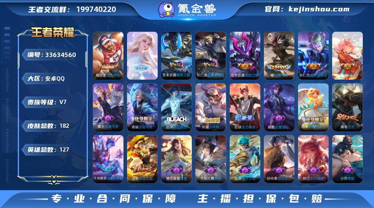 贵族等级7/荣耀典藏数量3/传说皮肤数量9/史诗皮肤数量58/皮肤数量182/英雄数量127/段位永恒钻石/空空儿全皮/程咬金-活力突击/吕布千魇归渊/安琪拉颠倒童话魔镜/孙悟空无相/甄姬-雪境奇遇/庄周牧野星辉/宫本武藏-幽冥之眼/狄仁杰-星际治安官/关羽神骥镇沧海/后羿神树通天/干将莫邪千山共赴/桑启-鸣野蒿/庄周-牧神诗旅/李白-诗剑行/曜-云鹰飞将/宫本武藏-地狱之眼/狄仁杰-超时空战士/姜子牙-天穹之誓/赵云-皇家上将/妲己-热情桑巴/孙尚香-蔷薇恋人/典韦-岱宗/狄仁杰-魔术师/项羽-海滩派对/关羽-百相守梦/亚瑟-潮玩骑士王/后羿-辉光之辰/干将莫邪-冰霜恋舞曲/裴擒虎-擒涛扼浪/嫦娥-拒霜思/桑启-海盐诗旅/艾琳-流音漫舞/司空震-地狱燃心/阿古朵-江河有灵/张良-古海寻踪/蒙犽-百解令/鬼谷子-天穹祈灯/沈梦溪-龙舞盛年/鲁班七号-蔬乡物语/李元芳-蔬乡物语/刘邦-剑破天穹/项羽-苍威无极/东皇太一-噬灭天穹/太乙真人-谧流熔炉/钟馗虚灵犬护/亚瑟荣光之誓/牛魔-星界战将/项羽九幽镇关/亚连-破空之剑/廉颇-撼地雄心/孙悟空-神迹守卫/百里守约-百相守梦/老夫子-百相守梦/孙膑-茶境仙/马超-访茗客/鸭鸭历险记-刘禅/沈梦溪鸭鸭历险记/百相守梦-周瑜/百相守梦-孙策/兰陵王傩神司/莱西奥光弋...