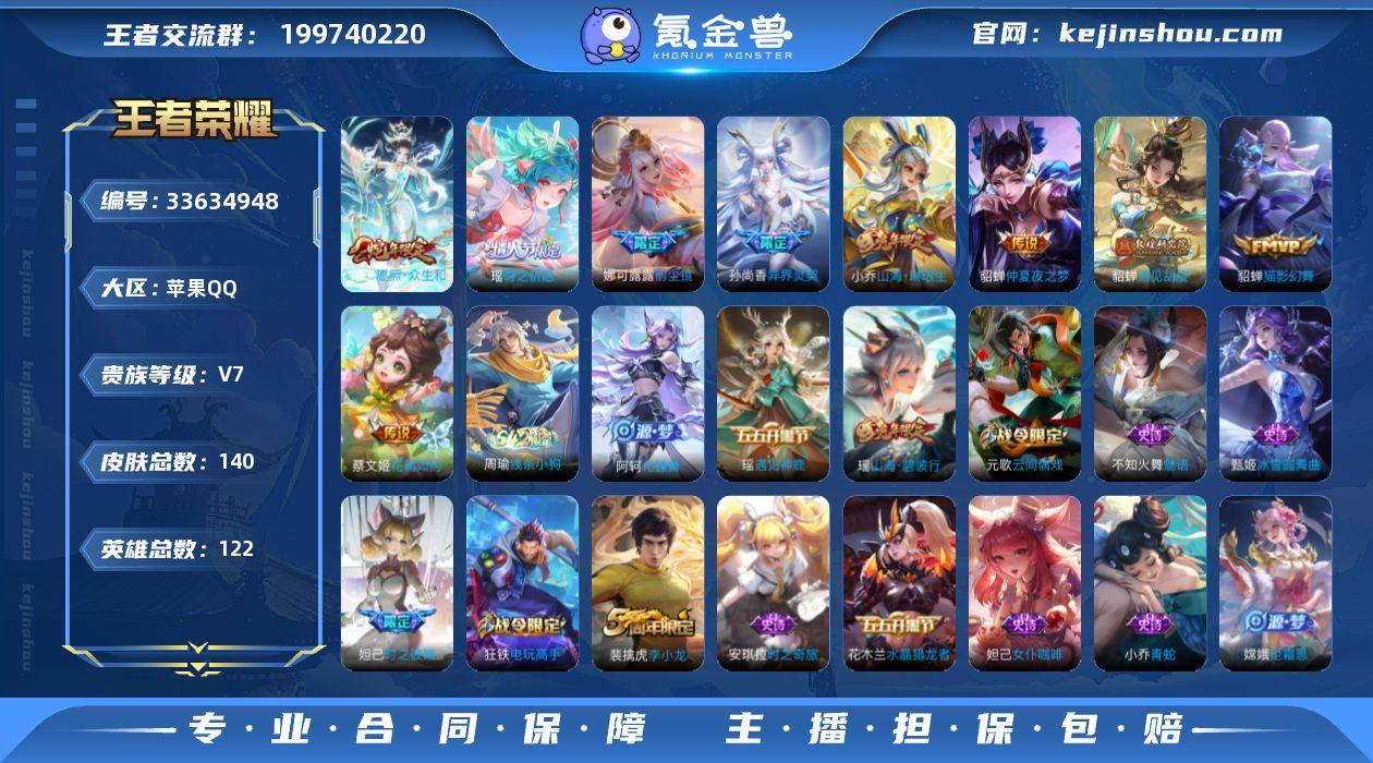 实名: 可修改 性别: 女号 贵族等级: V7 英雄数: 122 皮肤数: 140 传说皮: 猫影幻舞,仲夏夜之梦,遇见胡旋,花朝如约,山海·琳琅生 限定皮: 李小龙,梁祝,异界灵契-孙尚香,天狼溯光者,时之彼端,时之祈愿-瑶,前尘镜,山海·碧波行,愿照·众生和 亮点: 【优质装备】:猫影幻舞,仲夏夜之梦(大飞蛾),遇见胡旋,花朝如约(花篮子),山海·琳琅生(小乔年限)
