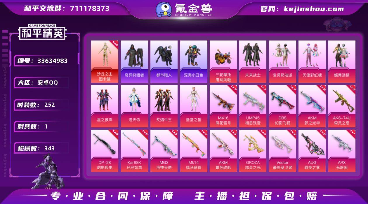 安卓 手Q-1神装-8粉装-14特效枪-1载具-16粉色飞行器-113133热力值-20王牌印记-252套装-343枪皮 【红色神装等级】:沙丘之主-图卡盟(二级) 【红色角色神装】:沙丘之主-图卡盟 【热门品类】:套装-浪漫天命,套装-都市猎人,套装-深海小丑鱼,套装-小丑鱼,套装-奇异狩猎者,套装-龟仙人,套装-暗影哥特,角色-Mark.06 【粉色套装】:粉装-未来战士,粉装-宝贝奶油派,粉装-天使彩虹糖,粉装-蝶舞迷情,粉装-星之彼岸,角色-洛天依,粉装-炙焰牛王,角色-圣堂之誓 【粉色枪皮等级】:AKM-梦之光华(六级),AKM-暮色玫影(三级),M416-风花雪月(七级),GROZA-精灵之光(三级),AUG-罪夜之冕(二级),ARX-无垠阁(一级),UMP45-相思残雪(七级),Vector-最终圣卫者(三级),AKS-74U-森灵之息(五级),Kar98K-巳巳如意(五级),Mk14-福马献瑞(三级),DBS-幻影飞狐(七级),DP-28-豹影疾电(五级),MG3-洛神天依(五级) 【粉色载具】:鬼马风驰 【粉色枪皮】:AKM-梦之光华,AKM-暮色玫影,M416-风花雪月,GROZA-精灵之光,AUG-罪夜之冕,ARX-无垠阁,UMP45-相思残雪,Vector-最终圣卫者,AKS-74U-森灵之息,Kar98K-巳巳如意,Mk14-福马献瑞,DBS-幻影飞狐,DP-28-豹影疾电,MG3-洛神天依 【粉...