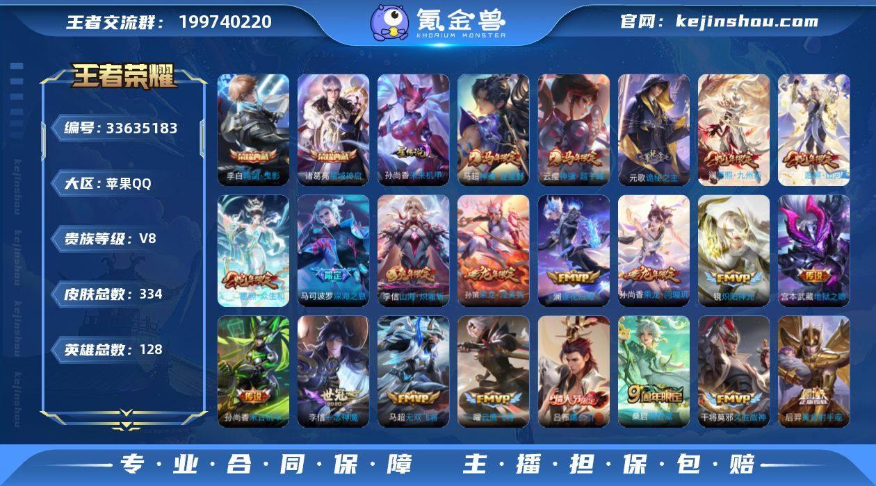 精品皮肤号,,限定多多,,14王者印记,,,33按键,,,1星传说,,夺宝次数12,,,五级铭文150级,,亲密度道具 苹果Q-V8-至尊星耀I段位-128英雄-332皮肤-2典藏皮肤-23传说-100史诗 【英雄全皮】:刘禅全皮,元歌全皮,孙权全皮,敖隐全皮,蒙恬全皮,司空震全皮,赵怀真全皮,影全皮 【荣耀典藏】:李白鸣剑曳影,诸葛亮星域神启 【传说皮肤】:云缨神骥越千峰,马超神骥逐星野,元歌诡秘之主,司空震愿照山河定,妲己愿照众生和,澜愿照九州拓,桑启鸣野蒿,吕布曦玄引,孙尚香乘龙问璇玑,孙策乘龙淬吴钩,澜逐花归海,马可波罗妄想实况,李信山海炽霜斩,马可波罗深海之息,马超无双飞将,镜炽阳神光,虞姬启明星使,曜云鹰飞将,李信一念神魔,干将莫邪久胜战神,后羿黄金射手座,孙尚香末日机甲,宫本武藏地狱之眼 【限定皮肤】:蒙犽顽岩魄,虞姬夏日便利店,姜子牙天穹之誓,杨戬破阵退雄兵,李白谪仙醉月,狄仁杰阴阳师,赵云皇家上将,赵云引擎之心,孙尚香蔷薇恋人,扁鹊奇幻香踪,元歌云间偶戏,元歌无心,马可波罗暗影游猎,马可波罗深海之息,马可波罗山海玄木吟,马可波罗妄想实况,狄仁杰魔术师,项羽海滩派对,韩信傲雪梅枪,兰陵王金庭之子,李元芳云中...