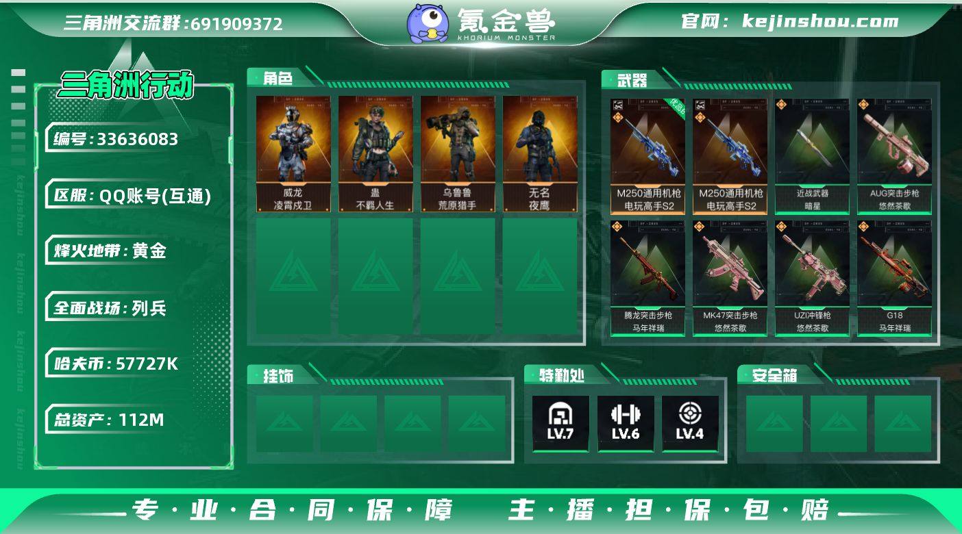 【SJZQH1759】总资产112M/哈夫币5772万/传说近战数1/传说枪皮数19/战场等级21/行动等级60/安全箱等时效性道具以游戏内数据为准,详情请看图/威龙-凌霄戍卫/无名-夜鹰(S4)/乌鲁鲁-荒原猎手/蛊-不羁人生/近战-暗星/近战-处刑者3级/近战-黑鹰/M250通用机枪-电玩高手S2/优品B典藏武器外观-M250通用机枪-电玩高手S2/QBZ95-1突击步枪-凌霄戍卫/AUG突击步枪-悠然茶歇/AK-12突击步枪-夜鹰/SCAR-H战斗步枪-启航/CAR-15突击步枪-黑鹰坠落/腾龙突击步枪-马年祥瑞/MK47突击步枪-悠然茶歇/MK47突击步枪-暗星/UZI冲锋枪-悠然茶歇/SMG45冲锋枪-骑士/SR-3M紧凑突击步枪-暗星/勇士冲锋枪-能天使-午夜邮差/M14射手步枪-蛮荒/M14射手步枪-缄花/SR-25射手步枪-缄花/.357左轮-缄花/G18-马年祥瑞/复合弓-黑-天际线/AKM突击步枪-林中猎手/QBZ95-1突击步枪-曙光/Ash-12战斗步枪-守夜人/K416突击步枪-腊梅/K416突击步枪-缄默情歌/M16A4突击步枪-竞赛选手/AUG突击步枪-蝮蛇/M7战斗步枪-禁卫/SG552突击步枪-尖端治疗/SG552突击步枪-深海恐惧/SCAR-H战斗步枪-囚徒/AS Val突击步枪-尖端治疗/腾龙突击步枪-猎鳄行动/K437突击步枪-丛林谍踪/MP5冲锋枪-深海恐惧/MP5冲锋枪-战术竞备/Vector冲锋枪-猎鳄行动/SMG4...