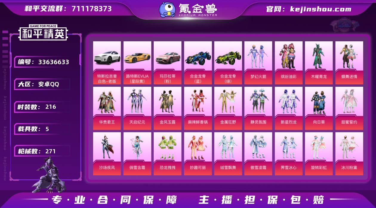 安卓 手Q-25粉装-15特效枪-5载具-6粉色飞行器-120862热力值-13王牌印记-216套装-271枪皮 【热门品类】:粉装-梦幻火箭,粉装-缤纷油彩,角色-军刀雅典娜,套装-金羽特工,套装-潮萌小黄鸭,套装-浪漫波比,套装-粉红小猪 【粉色套装】:粉装-木曜青龙,粉装-蝶舞迷情,粉装-梦幻火箭,粉装-华贵君王,粉装-天启纪元,粉装-金风玉露,粉装-麻辣鲜香锅,粉装-金属狂野,粉装-静灵氛围,粉装-缤纷油彩,粉装-新星烈龙,粉装-向日葵,粉装-甜蜜誓约,粉装-沙场疾风,粉装-俏雪含霜,粉装-恐龙拽拽,粉装-妙趣可丽,粉装-绒雪飘舞,粉装-傲雪凌霜,粉装-霁雪冰心,粉装-旋转彩虹,粉装-冰川粉黛,粉装-冰川幽秘,粉装-冰川红玫,角色-绯穹魔姬 【粉色枪皮等级】:AKM-炫紫旋律(六级),SCAR-L-梦幻火箭(五级),M416-五爪金龙(六级),AUG-妙趣可丽(六级),M762-甜蜜誓约(五级),ACE32-萌骑漫游(一级),UMP45-相思残雪(五级),Vector-环太平洋(一级),Vector-月中灵(六级),Kar98K-伏魔团(五级),Kar98K-巳巳如意(三级),Mini14-龙虾霸霸(五级),Mk14-福马献瑞(四级),M249-绒雪飘舞(四级),DP-28-豹影疾电(五级) 【粉色载具】:特斯拉Model X(珍珠白),路特斯EVIJA(星际黄),玛莎...