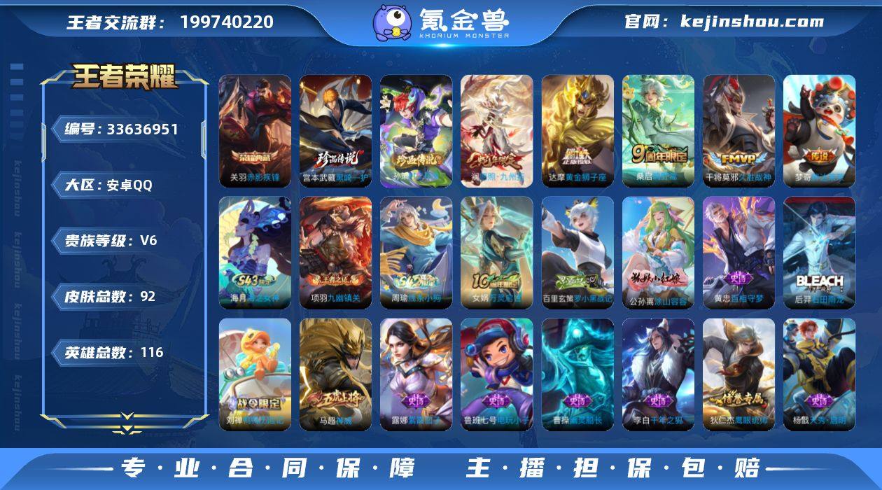 【精品小号·赤影疾锋·黑崎一护·孙策时之奇旅·愿照九州拓·财神纳福天幕·无二次包过】YXw25333-安卓Q-116英雄-92皮肤-4王者印记-60铭文-贵族积分1w【贵族6】【1典藏·2珍品·5传说·1天幕·1按键】【因赛季更新游戏段付以上号为准!】 【荣耀典藏】:关羽赤影疾锋 【珍品传说】:宫本武藏黑崎一护,孙策时之奇旅 【天幕】:财神纳福天幕 【传说皮肤】:澜愿照九州拓,桑启鸣野蒿,干将莫邪久胜战神,达摩黄金狮子座,梦奇胖达荣荣 【限定皮肤】:狄仁杰阴阳师,赵云皇家上将,高渐离玩趣恶龙,狄仁杰魔术师,项羽海滩派对,鬼谷子天穹祈灯 【年限皮肤】:澜愿照九州拓 【赛季限定】:鬼谷子天穹祈灯,东皇太一噬灭天穹,太乙真人谧流熔炉,钟馗虚灵犬护,甄姬逆浪荇歌,亚瑟荣光之誓,项羽九幽镇关 【战令限定】:孙膑茶境仙,马超访茗客,刘禅鸭鸭历险记,沈梦溪鸭鸭历险记,周瑜线条小狗 【史诗皮肤】:海月海之女神,周瑜线条小狗,项羽九幽镇关,女娲万灵启世,百里玄策罗小黑战记,公孙离涂山容容,黄忠百相守梦,后羿石田雨龙,刘禅鸭鸭历险记,孙膑茶境仙,杨戬天秀启明,马超神威,狄仁杰鹰眼统帅,孙策猫狗日记,阿轲节奏热浪,程咬金功夫厨神,李元芳逐浪之夏,百里守约特...