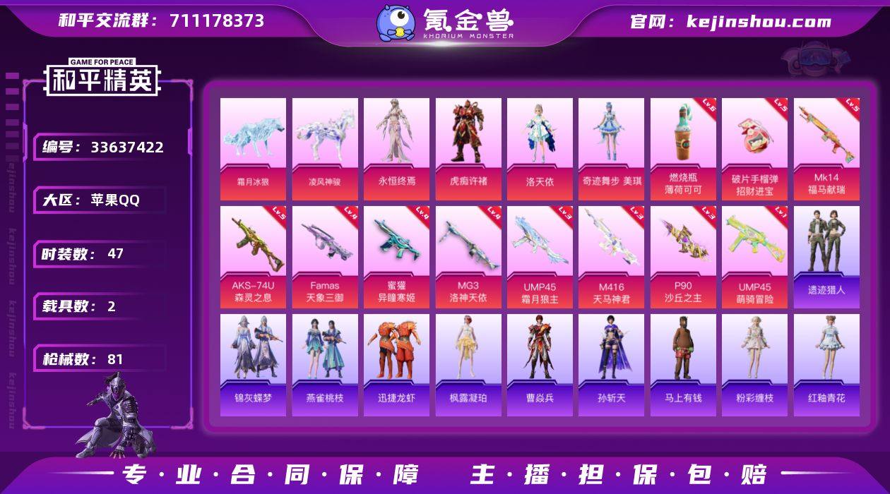【kyhp1939】苹果 手Q-4粉装-11特效枪-2载具-7粉色飞行器-30931热力值-4王牌印记-47套装-81枪皮 【粉色套装】:角色-洛天依,角色-奇迹舞步 美琪,角色-虎痴许褚,角色-永恒终焉 【粉色枪皮等级】:UMP45-霜月狼主(三级),M416-天马神君(三级),蜜獾-异瞳寒姬(四级),Famas-天象三御(四级),UMP45-萌骑冒险(一级),AKS-74U-森灵之息(五级),P90-沙丘之主(三级),Mk14-福马献瑞(五级),MG3-洛神天依(四级),燃烧瓶-薄荷可可(六级),破片手榴弹-招财进宝(五级) 【粉色载具】:凌风神骏,霜月冰狼 【粉色枪皮】:M416-天马神君,蜜獾-异瞳寒姬,Famas-天象三御,UMP45-萌骑冒险,UMP45-霜月狼主,AKS-74U-森灵之息,P90-沙丘之主,Mk14-福马献瑞,MG3-洛神天依,燃烧瓶-薄荷可可,破片手榴弹-招财进宝 【粉色飞行器】:香车宝马飞行器,炫彩糖果飞行器,幻海精灵飞行器,曦光华影飞行器,暮色之舞飞行器,冰狼掠影飞行器,六号石头人降落伞 【粉色降落伞】:异瞳寒姬降落伞,炫彩糖果降落伞,暮色玫影降落伞,罪夜之冕降落伞,辉光之愿降落伞,虎痴许褚降落伞,霜月狼主降落伞,百变纱华降落伞 【稀有套装】:角色-超感刻度,套装-雪国风尚,套装-炫彩糖果,套装-马上有钱,套装-...