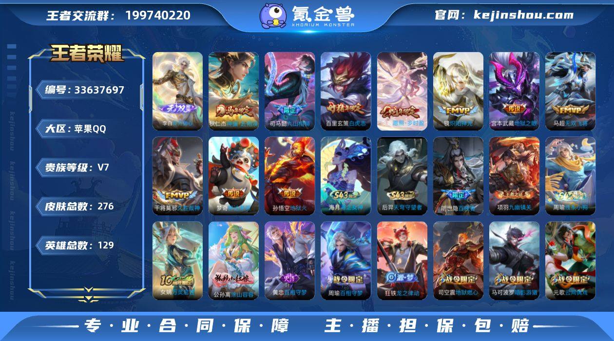 实名: 可修改 贵族等级: V7 英雄数: 129 皮肤数: 276 无双皮: 碎月剑心 传说皮: 久胜战神,炽阳神光,地狱火,地狱之眼,胖达荣荣,无双飞将,九山相柳,神骥·赴朔漠 限定皮: 遇见飞天,李小龙,时之彼端,白虎志,高山流水,猪悟能,五谷丰年,愿照·岁时盈
