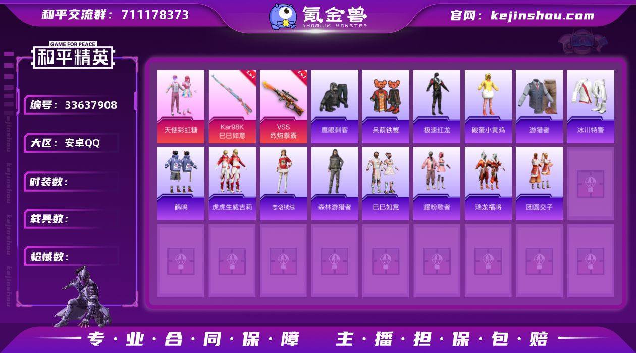 WJ921+安卓手Q-1粉装-2特效枪-77套装-78枪皮-2王牌印记-不朽星钻Ⅲ-22458热力值【1粉装】天使彩虹糖【2特效枪】Kar98K-巳巳如意[5级],VSS-烈焰拳霸[5级]【1飞行器】红色滑翔尾迹【1背包】梦幻火箭背包【152其它衣服和枪皮】潮流炫酷,缤纷果语,巳巳如意,六六大吉,时空追击者,马上有钱,蓝彩潮人,幻世战舞者,甜蜜熊情侣,瑞龙福将,夏日音浪,白色伏地魔,极速红龙,香榭午后,灼焰舞者,耀粉歌者,黑色伏地魔,萌趣颜团子,SS37特训,SS36特训,森林游猎者,呆萌铁蟹,魅力单车,幻影武者,狙击之神,福星高照,SS20特训,猛禽,青涩时光,冰川特警,探宝勇士,炫蓝之夏,战术大师,浑天鲲鹏,酒红色名流,SS38特训,特训学院,特种颜团子,黄色运动,完美偶像,SS21特训,红色运动,吉莉礼服,冷焰舞者,白熊同盟,SS18特训,竞技名士,SS19特训,滨海假日,深蓝色名流,破蛋小黄鸡,鹤鸣,长空猛禽,蓝色守护者,SS31特训,街头潮人,SS15特训,蓝色运动,特殊使命,团圆交子,怒火燎原,湖蓝色名流,SS17特训,黄色名流,耀眼新星,绮丽涂鸦,都市魅力,鹰眼刺客,虎虎生威吉莉,暴风机械师,天籁歌者,SS16特训,猎鹰,恋语绒绒,人气偶像,格斗先锋,AKM-彩虹符号,UZI-幻影战神,SCAR-L-玉兔迎春,UMP45-诡娃娃,MG-36-薄荷星砂,M24-影袭,蜜獾-启元战...