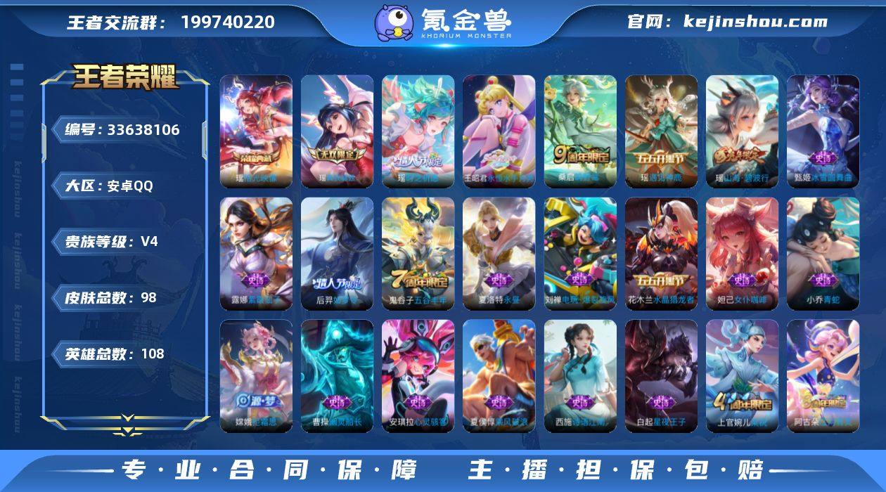 0BF5NG可二次无双1水晶1极品女号传说3优质限定4 钱包已注销、信用分正常、无设备脸 水晶皮肤:拾光映像, 无双皮肤:真我赫兹(瑶), 传说限定:永恒水手月亮,时之祈愿-瑶, 传说皮肤:鸣野蒿, 史诗限定:如梦令-后羿,山海·碧波行, 优质史诗皮肤:永昼,青蛇,诗语江南,遇见神鹿, 周年皮肤:江河有灵,梁祝,五谷丰年, 珍宝阁:女武神, 史诗皮肤:星夜王子,乘风破浪,幽灵船长,水晶猎龙者,心灵战警,猫狗日记-孙策,鬼剑武藏,紫霞仙子,冰冠公主,缤纷独角兽,金属风暴,女仆咖啡,冰雪圆舞曲,圣诞恋歌,心灵骇客,拒霜思,水果甜心,奇遇舞章,逐浪之夏,电玩·爆裂旋风,舞动绿茵,猫狗日记-大乔, 贵族4 荣耀典藏1 无双1 传说皮肤3 史诗皮肤34 皮肤数量98 皮肤价值:91452 英雄108 荣耀黄金IV 总场次3558