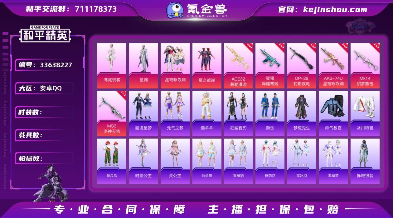 WJ916安卓手Q-3粉装-7特效枪-60套装-106枪皮-6王牌印记-不朽星钻Ⅴ-32900热力值【3粉装】角色-鸢尾珑雾,星之彼岸,星穹咏叹调【7特效枪】蜜獾-异瞳寒姬[5级],MG3-洛神天依[5级],Mk14-甜梦熊击[5级],AKS-74U-星穹咏叹调[7级],Mk14-福马献瑞[5级],ACE32-萌骑漫游[5级],DP-28-豹影疾电[5级]【2稀有】S686-奇异狩猎者,AKM-缤纷海域【8飞行器】破刃行动尾迹,马上有福飞行器,登顶巅峰飞行器,异域银装飞行器,狂鲨锋刃飞行器,霓虹漫游飞行器,百变魔方飞行器,灵珠游龙飞行器【1头盔】梦幻火箭头盔【154其它衣服和枪皮】香桃花海,福马献瑞,老实芭蕉,SS37特训,角色-霜纹水星,顶瓜瓜,蓝冰羽,柠萌假日,紫幽梦,薄荷星砂,角色-无面战甲,星影赞美诗,阳光火鸡,雨过天青,SS36特训,马上来财,雪国风尚,王牌教练,凌霄紫焰,角色-灵公主,彩虹兔,SS38特训,完美偶像,梦魇先生,狙击之神,星渊小夜曲,异域银装,元气之梦,超能勇士,疯狂小兔子,朱霞炽焰,小鸟芋圆,粉恋花,SS32特训,角色-时希公主,风暴特警,画境星梦,狂鲨锋刃,大橘大利,青翼流星,雪绒豹,迅捷龙虾,SS34特训,街头风暴,玩偶服-懒羊羊,海岛探路者,SS33特训,云朵鹅,游乐,琴音绮想,燕雀桃枝,青涩时光,红釉青花,缤纷果语,冰川特警,SS35特训,擎苍青焰,汤...