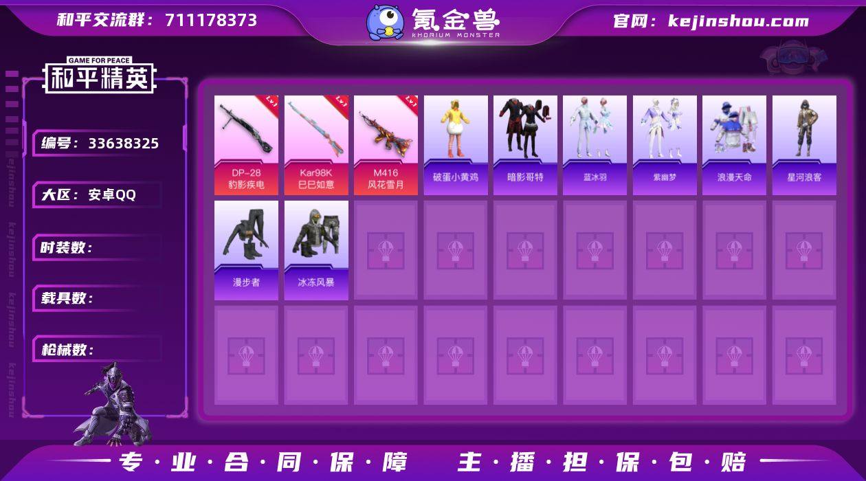 WJ915【4特效枪 暗影哥特,浪漫天命 M416-风花雪月[4级】安卓手Q-4特效枪-29套装-35枪皮-0王牌印记-坚韧铂金Ⅰ-9495热力值【4特效枪】Kar98K-巳巳如意[2级],Mk14-福马献瑞[5级],DP-28-豹影疾电[2级],M416-风花雪月[4级【2稀有】暗影哥特,浪漫天命【1飞行器】马上有福飞行器【65其它衣服和枪皮】深蓝色名流,漫步者,冰冻风暴,青翼流星,破蛋小黄鸡,玲珑侠影,SS33特训,角色-霜刃之御,完美偶像,黄色伏地魔,星河浪客,SS34特训,SS37特训,SS36特训,迅捷龙虾,马上有钱,黄色运动,紫幽梦,蓝冰羽,蓝色运动,薄荷星砂,SS32特训,黄色名流,狙击之神,SS38特训,福马献瑞,魅力单车,蜜獾-启元战纹,SCAR-L-玉兔迎春,GROZA-福马献瑞,MG3-霓彩脉冲,AUG-紫晶流影,M24-炫彩节奏,ACE32-冰晶雪宝,PKM-紫幽梦,GROZA-影袭,MG3-幻世战舞者,燃烧瓶-福马献瑞,S12K-智耀战神,AUG-异域银装,Mk14-紫幽梦,Vector-荒原烈焰,MG3-火熔核心,SCAR-L-炫彩节奏,DBS-彩虹符号,P90-紫矿核心,AKM-龙的传人,DP-28-彩虹符号,ARX-像素花束,汤姆逊-像素花束,S1897-糯团青竹,S1897-荧海星豚,S1897-紫幽梦,MG-36-薄荷星砂,P90-魔法小松鼠,MG3-智耀战神,P92-紫幽梦,平底锅-紫幽梦,20-H-狂鲨锋刃,SLR-乌木金纹,12-乌木金纹,M200-乌木金...