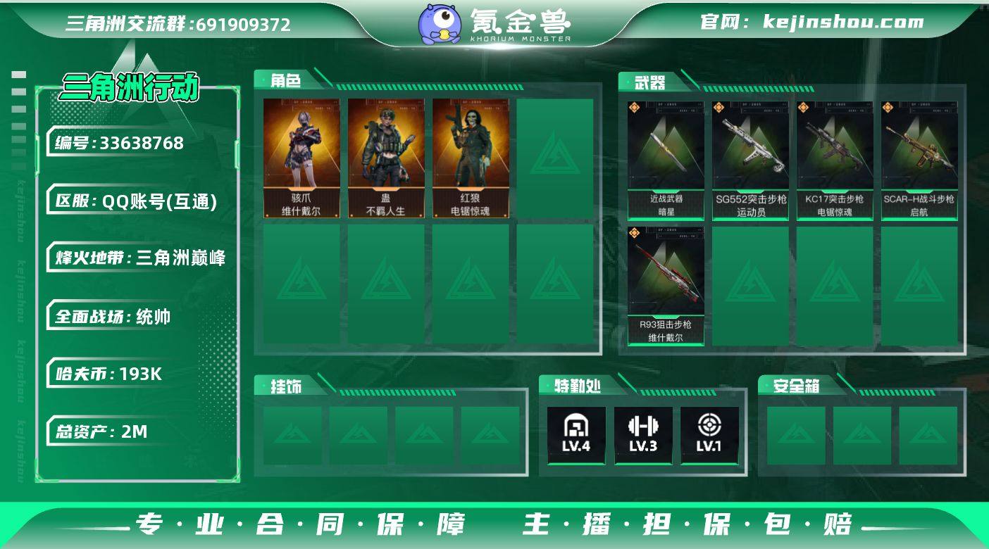 【953652】[18472077]总资产:2.2M 4干员外观 1近战传说 14传说枪械 哈夫币:193.577K 可二次 可修改实名 【烽火地带段位】三角洲巅峰 【全面战场段位】上等兵 【干员外观】蛊-不羁人生,骇爪-维什戴尔,红狼-电锯惊魂,露娜-金牌射手(S7) 【传说武器皮肤】近战武器-暗星,SG552突击步枪-运动员,R93狙击步枪-维什戴尔,SCAR-H战斗步枪-启航,KC17突击步枪-电锯惊魂,MK47突击步枪-悠然茶歇,M14射手步枪-缄花,AUG突击步枪-悠然茶歇,.357左轮-缄花,UZI冲锋枪-悠然茶歇,SR-25射手步枪-缄花,AWM狙击步枪-万金泪冠,M14射手步枪-蛮荒,K416突击步枪-行动记录
