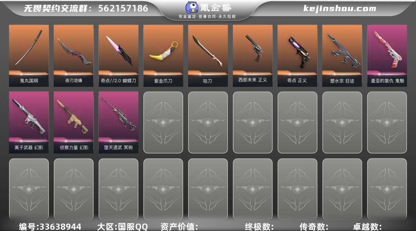 【英雄】:幻棱,炼狱,维斯,暮蝶,钛狐,壹决,捷风,雷兹,幽影,不死鸟,贤者,猎枭,零,芮娜,奇乐,尚勃勒,霓虹,斯凯,夜露,K/O,海神,盖可 【近战武器】:近战武器-奇点//2.0 蝴蝶刀,近战武器-紫金爪刀,近战武器-鬼丸国纲,近战武器-祜刀,近战武器-夜刃诡镰,近战武器-阿特拉斯指挥部 甩棍 【狂徒】:狂徒-塑水宗,狂徒-离子武器//2.0,狂徒-赤焰铁骥 【幻影】:幻影-离子武器,幻影-侦察力量 【冥驹】:冥驹-堕天遗武 【战神】:战神-星航勇进 【标配】:标配-樱花 【正义】:正义-奇点,正义-西部未来 【鬼魅】:鬼魅-盖亚的复仇 【卡面】:Clutch 卡面,无畏契约GO!第一卷:芮娜 卡面,无畏契约GO!第一卷:零 卡面,《双城之战》金克丝 卡面,代号红色 卡面,新兵报到 卡面,V契约 卡面,无畏契约 卡面 【喷漆】:审判之爪 喷漆,霓光四射 喷漆,买装还是存钱 喷漆,关门放狗 喷漆,无畏契约GO!第一卷:贤者 喷漆,胜利属于无畏契约 喷漆,GLHF 喷漆,无畏契约 喷漆 【挂饰】:无畏契约GO!第一卷 零 挂饰,瞬云履 挂饰,天外飞客 挂饰,无畏契约 纪念币 挂饰