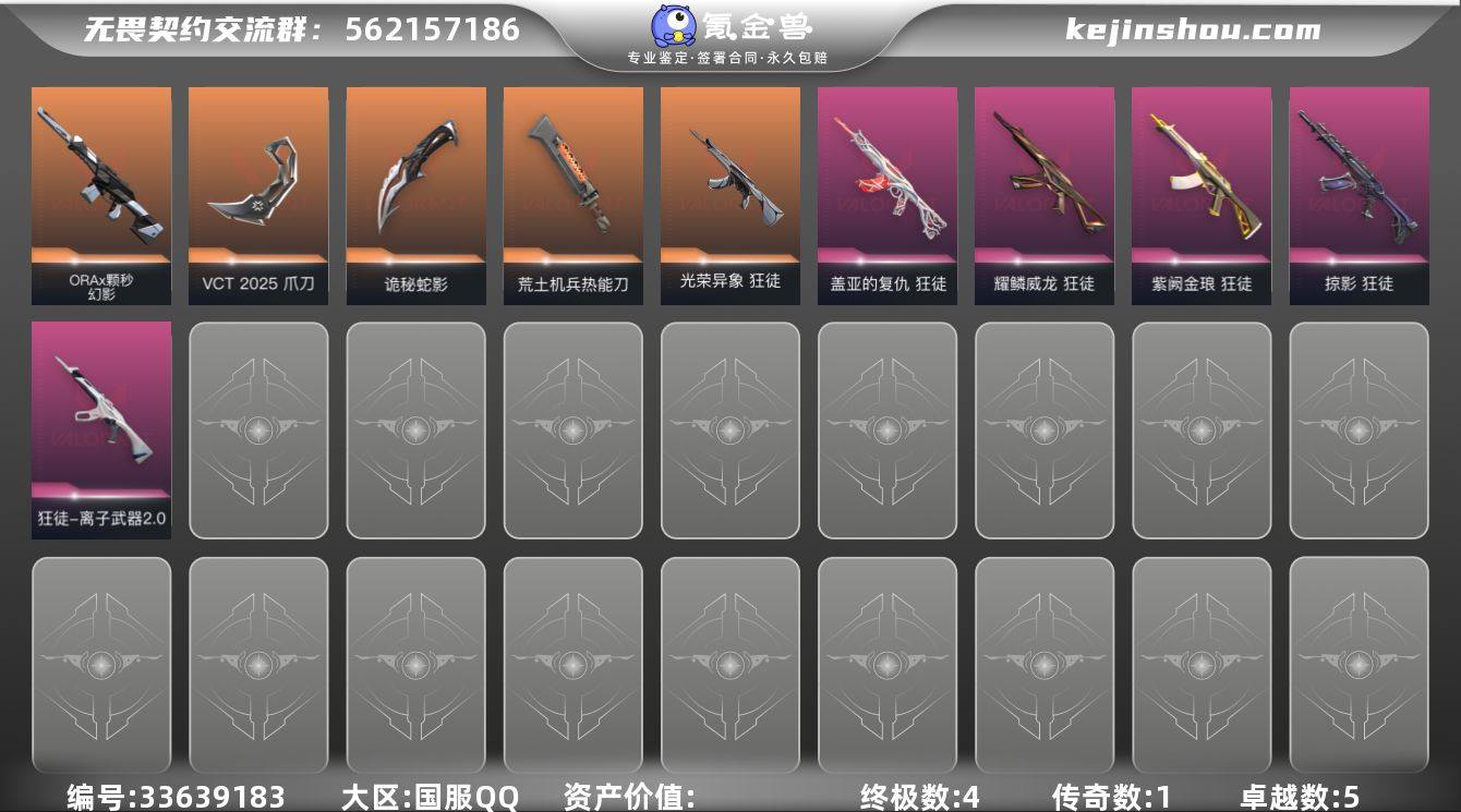 【957538】[18718258]4橙皮 1金皮 5紫皮 38皮肤 29英雄 101卡面 615已用源晶 白银段位 可二次 可修改实名 【套装】VCT 2025赛季礼包,VCTCN2025套装 【近战武器皮肤】VCT 2025 爪刀,诡秘蛇影,荒土机兵热能刀 【步枪皮肤】狂徒-离子武器2.0,狂徒-掠影,幻影-ORAx颗秒,狂徒-光荣异象,狂徒-紫阙金琅,狂徒-盖亚的复仇,狂徒-耀鳞威龙 【挂饰】V26第一幕纪念币 挂饰,无畏契约GO!第一卷芮娜挂饰,无畏契约GO!第一卷零挂饰,聚宝蛋挂饰,无畏契约GO!第一卷贤者挂饰,无畏契约GO!第一卷捷风挂饰,飞刀挂饰,蓄势待滚挂饰,VCT2025太平洋联赛挂饰,VCT2025美洲联赛挂饰,VCT2025EMEA联赛挂饰,VCT2025CN联赛挂饰,双城之战小蛋糕挂饰,神中神挂饰