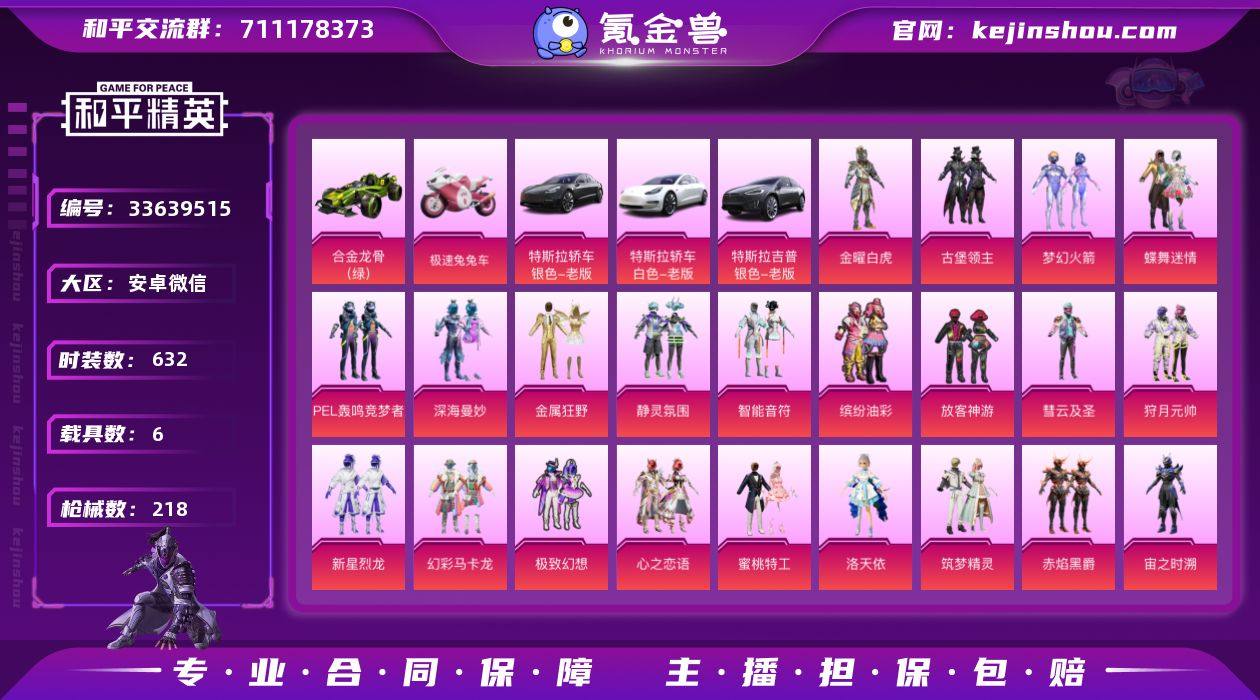 【958596】[18831833]25粉装 6特效枪 6载具 1印记 可二次 可修改实名 【热门装扮】奇异狩猎者,梦幻火箭(新101) ,洛天依,金曜白虎,蝶舞迷情,幻彩马卡龙,缤纷油彩(猪妹猪脸妹),新星烈龙(小白龙),心之恋语,深海曼妙,金属狂野,静灵氛围,智能音符,古堡领主,PEL轰鸣竞梦者,极致幻想,狩月元帅,彗云及圣,扶摇飞仙,放客神游,蜜桃特工,筑梦精灵,赤焰黑爵,冷魅冰骑,第五大道,宙之时溯,神秘黑猫,软萌银虎,奇迹天团,激萌罗小黑,大橘为重,浪漫波比 【载具】玛莎拉蒂Ghibli(蓝),合金龙骨(绿),特斯拉Model X(冷光银),特斯拉Model 3(冷光银),特斯拉Model 3(珍珠白),极速兔兔车 【稀有枪皮】DP-28-豹影疾电,M416心之恋语,M762甜蜜誓约,AKM炫紫旋律,DP-28扶摇飞仙,SCAR-L纯梦嫁纱 【七级特效枪】七级AKM-炫紫旋律,七级DP-28-扶摇飞仙,七级M416-心之恋语 【六级特效枪】六级SCAR-L-纯梦嫁纱 【五级特效枪】五级M762-甜蜜誓约 【一级特效枪】一级DP-28-豹影疾电 【紫色装扮】SS34特训套装,格斗先锋,柠萌假日,朋克治安官,探宝勇士,夏日音浪,北国孤狼,圣诞大吉,完美偶像,帅气教官,幻世战舞者,战地菁英,海岛探路者,王牌教练,甜蜜熊情侣,甜蜜菠萝,疯狂小兔子,白熊同盟,神秘领域,竞技勇士朋克,滨海假...