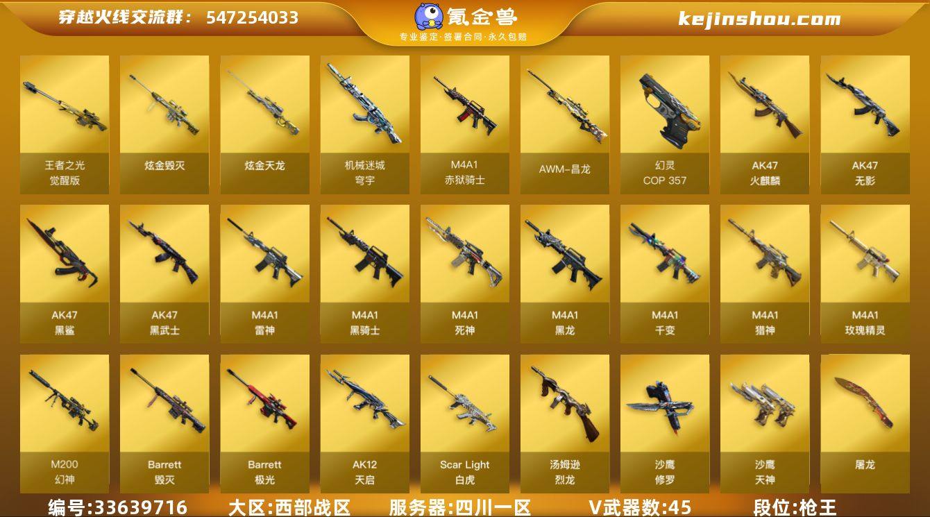 【ky7040】四川一区-55V-6王者武器数-4炫金武器数 【热门武器】:Scar Light-白虎,M200-幻神,死亡之眼*2,M4A1-黑骑士,汤姆逊-烈龙*6,COP 357-幻灵*2,沙鹰-修罗*2 【王者炫金武器】:高爆手雷-雷霆王者,炫金毁灭,炫金天龙*3 【音效卡】:屠龙-电竞之星-竞星跃动音效卡,AK47-火麒麟音效卡,Barrett-极光音效卡,HK417-朱雀-电竞之星-竞星跃动音效卡 【皮肤】:雷神-暗月,雷神-星空,雷神-宇航兔皮肤,毁灭-星空,毁灭-英雄计划 皮肤,黑龙-暗月,无影耀金皮肤,天启-暗月,极光-能量核心,修罗-能量核心 【角色】:葵,樱,战地猎狐,王者影豹,乔伊教练,云海玲珑,幻面灵狐,飞虎队-X,风暴女,娟娟,灵狐者-X,灵狐者-黄金海岸,潘多拉-甜心教官,新娜塔莎,雪莉杨-摸金校尉,游珑儿 【人偶武器】:星神-炽天使,夺魂,迷你牛牛 【暴走生化】:死亡之眼*2,超级对讲机 【挑战大师】:激光毁灭者III-白马银枪,神圣爆裂者-末日III*2 【英雄级武器】:M4A1-千变,AK47-火麒麟,M4A1-黑龙*2,M4A1-雷神*2,M4A1-黑骑士,AK47-无影,M4A1-死神,AK47-黑武士,AK12-天启,AK47-黑鲨,Scar Light-白虎,M4A1-玫瑰精灵,M4A1-猎神*3,HK417-朱雀-电竞之星,机械迷城-穹宇...
