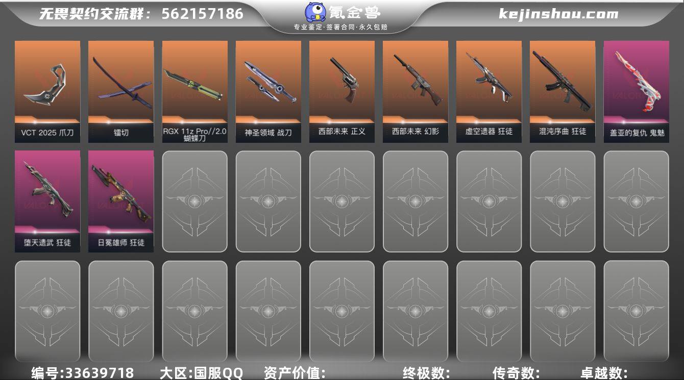 【套装】:VCT 2025 赛季套装 【英雄】:幻棱,炼狱,暮蝶,钛狐,壹决,铁臂,捷风,雷兹,幽影,不死鸟,贤者,猎枭,零,芮娜,尚勃勒,霓虹,斯凯,K/O,海神,盖可,黑梦 【近战武器】:近战武器-RGX 11z Pro//2.0 蝴蝶刀,近战武器-VCT 2025 爪刀,近战武器-镭切,近战武器-诡秘蛇影 军刀,近战武器-神圣领域 战刀 【狂徒】:狂徒-2025全球冠军赛,狂徒-混沌序曲,狂徒-虚空遗器,狂徒-噬影者,狂徒-堕天遗武,狂徒-日冕雄师,狂徒-诡秘蛇影 【幻影】:幻影-西部未来,幻影-神圣领域,幻影-末日之翼,幻影-西部未来 【戍卫】:戍卫-奇幻朋克//2.0,戍卫-月球哨兵,戍卫-折光棱晶 【獠犬】:獠犬-神圣领域 【冥驹】:冥驹-星云暗涌 【飞将】:飞将-末日之翼 【莽侠】:莽侠-诡秘蛇影,莽侠-月球哨兵 【战神】:战神-神圣领域 【奥丁】:奥丁-末日之翼 【判官】:判官-诡秘蛇影 【雄鹿】:雄鹿-月球哨兵 【骇灵】:骇灵-星云暗涌 【蜂刺】:蜂刺-星云暗涌,蜂刺-折光棱晶 【标配】:标配-超能偶像,标配-折光棱晶 【正义】:正义-西部未来,正义-纳米打击,正义-月球哨兵 【鬼魅】:鬼魅-盖亚的复仇,鬼魅-诡秘蛇影,鬼魅-星云暗涌 【狂怒】:狂怒-神圣领域 【短炮】:短...