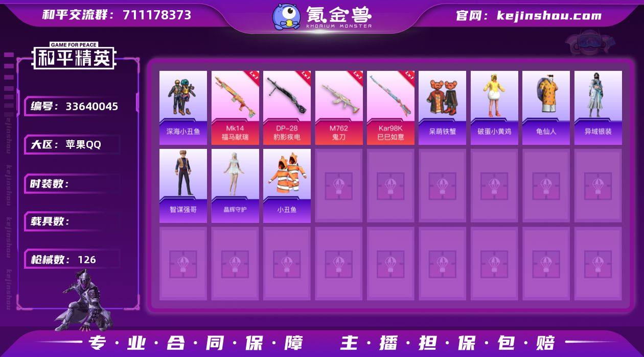 XS11591【可二次】苹果手Q-4特效枪-95套装-126枪皮-12王牌印记-荣耀皇冠Ⅴ-33782热力值【4特效枪】Kar98K-巳巳如意[5级],M762-鬼刀[7级],DP-28-豹影疾电[5级],Mk14-福马献瑞[5级]【3稀有】深海小丑鱼,小丑鱼,AKM-缤纷海域【5飞行器】炫彩糖果飞行器,破刃行动尾迹,空岛之星尾迹,异域银装飞行器,登顶巅峰飞行器【2头盔】深海小丑鱼头盔,金羽特工头盔【1背包】幻影战神背包【214其它衣服和枪皮】鱼渊荷华,SS35特训,福马献瑞,红色运动,雨过天青,绯格组合,旭日情侣,SS28特训,迎春赐吉,晶辉守护,黄色伏地魔,人气偶像,破晓战魂,热情海星,蝶变,竞技达人朋克,炫彩糖果,酒红色名流,SS36特训,黄色运动,SS33特训,耀粉歌者,巳巳如意,猛禽,阳光火鸡,SS27特训,龟仙人,智谋强哥,春日漫步,锦衣飞扬,SS38特训,极速红龙,SS32特训,特战装甲,街头潮人,滨海厨神,灼焰舞者,迅捷龙虾,角色-Mark.06,SS29特训,大橘大利,深蓝色名流,龙魂突击队,红釉青花,马上有钱,SS30特训,蓝色运动,海岛探路者,纯真浪花,冷焰舞者,特训学院,竞技名士,惊鸿侠骨,战地督导,SS31特训,完美偶像,SS34特训,香桃花海,SS26特训,锦灰蝶梦,燕燕于飞,幻影武者,青涩时光,SS37特训,长空猛禽,异域银装,白色伏地魔,破蛋小黄鸡,鹤鸣,青玉碎影...