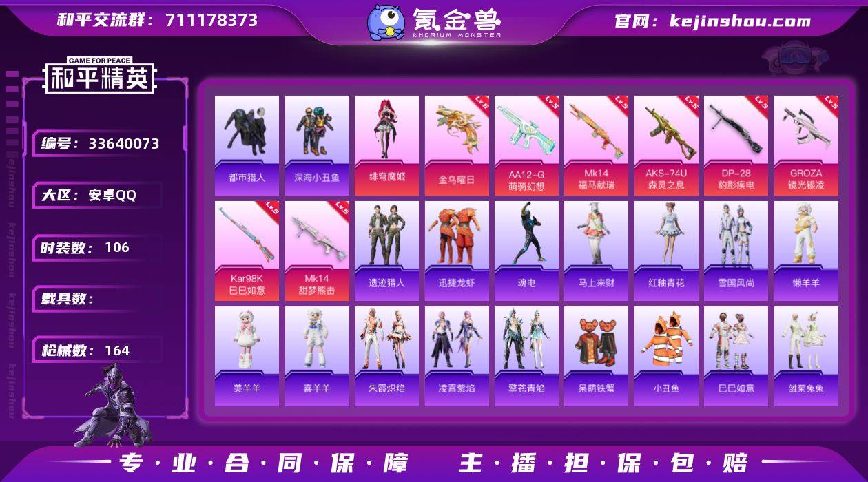 【mhp1302】安卓 手Q-1粉装-8特效枪-0载具-3粉色飞行器-40934热力值-8王牌印记-106套装-164枪皮 【热门品类】:套装-都市猎人,套装-深海小丑鱼,套装-小丑鱼 【粉色套装】:角色-绯穹魔姬 【粉色枪皮等级】:GROZA-镜光银凌(五级),AKS-74U-森灵之息(五级),Kar98K-巳巳如意(五级),Mk14-甜梦熊击(五级),Mk14-福马献瑞(五级),AA12-G-萌骑幻想(五级),DP-28-豹影疾电(五级),信号枪-金乌曜日(六级) 【粉色枪皮】:GROZA-镜光银凌,AKS-74U-森灵之息,Kar98K-巳巳如意,Mk14-甜梦熊击,Mk14-福马献瑞,AA12-G-萌骑幻想,DP-28-豹影疾电,信号枪-金乌曜日 【粉色飞行器】:炫彩糖果飞行器,动力核心飞行器,极意拳锋飞行器 【粉色降落伞】:未来领航者降落伞,幻影飞狐降落伞,幻彩电音降落伞,炫彩糖果降落伞,小舞降落伞,鸢尾珑雾降落伞 【稀有套装】:套装-巳巳如意,套装-雪国风尚,套装-炫彩糖果,角色-魂电,套装-马上来财,套装-迅捷龙虾,套装-遗迹猎人,套装-雏菊兔兔,套装-萝兰蝴蝶,角色-达芬奇,角色-狂花道·娜可露露,套装-糖糖葫芦,套装-青团波波,角色-许七安,套装-燕燕于飞,套装-鱼渊荷华,套装-风舞幻音,套装-紫幽梦,套装-蓝冰羽,套装-霓虹热舞,套...