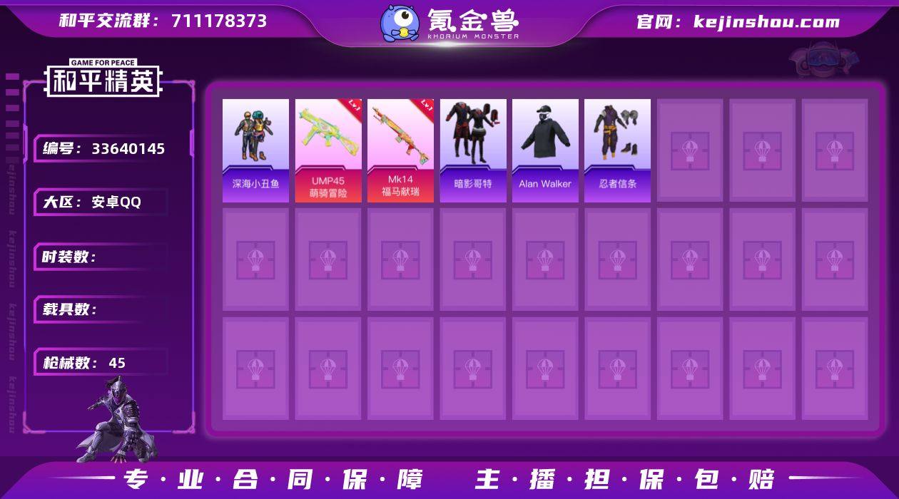 XS11588【可二次】安卓手Q-2特效枪-31套装-45枪皮-1王牌印记-荣耀皇冠Ⅲ-9293热力值【2特效枪】UMP45-萌骑冒险[3级],Mk14-福马献瑞[5级]【3稀有】忍者信条,暗影哥特,深海小丑鱼【2飞行器】鸡智如我飞行器,马上有福飞行器【1背包】幻影战神背包【71其它衣服和枪皮】马上有钱,雪国风尚,SS36特训,风暴特警,Alan Walker,雪山征服者,黄色名流,阳光火鸡,红釉青花,蓝色运动,遗迹猎人,福马献瑞,黄色运动,雨过天青,迅捷龙虾,魅力单车,完美偶像,SS37特训,街头潮人,海岛探路者,清新柠檬,红色运动,角色-幸运青,绯格组合,萌鸡速递,SS38特训,元素星魂,狙击之神,GROZA-福马献瑞,UZI-影袭,M416-小财神当家,ARX-像素花束,SLR-霓彩脉冲,AUG-耀粉歌者,M24-影袭,MG3-火熔核心,MG3-幻世战舞者,PKM-雨过天青,破片手榴弹-拽到爆炸,SCAR-L-夜灯,ACE32-冰晶雪宝,S12K-夜灯,AA12-G-雨过天青,大砍刀-像素花束,Famas-霓彩脉冲,M16A4-雨过天青,UMP45-夜灯,AKM-龙的传人,汤姆逊-像素花束,MG-36-薄荷星砂,AKM-霓彩脉冲,AUG-青春冒险家,蜜獾-启元战纹,沙漠之鹰-雨过天青,Mini14-香桃花海,汤姆逊-天降萌叽,M416-蓝色火焰,P90-紫矿核心,S12K-霓彩脉冲,S686-生命誓言,燃烧瓶-福马献瑞,GROZA-影袭,Mini14-穿刺龙虾,S...