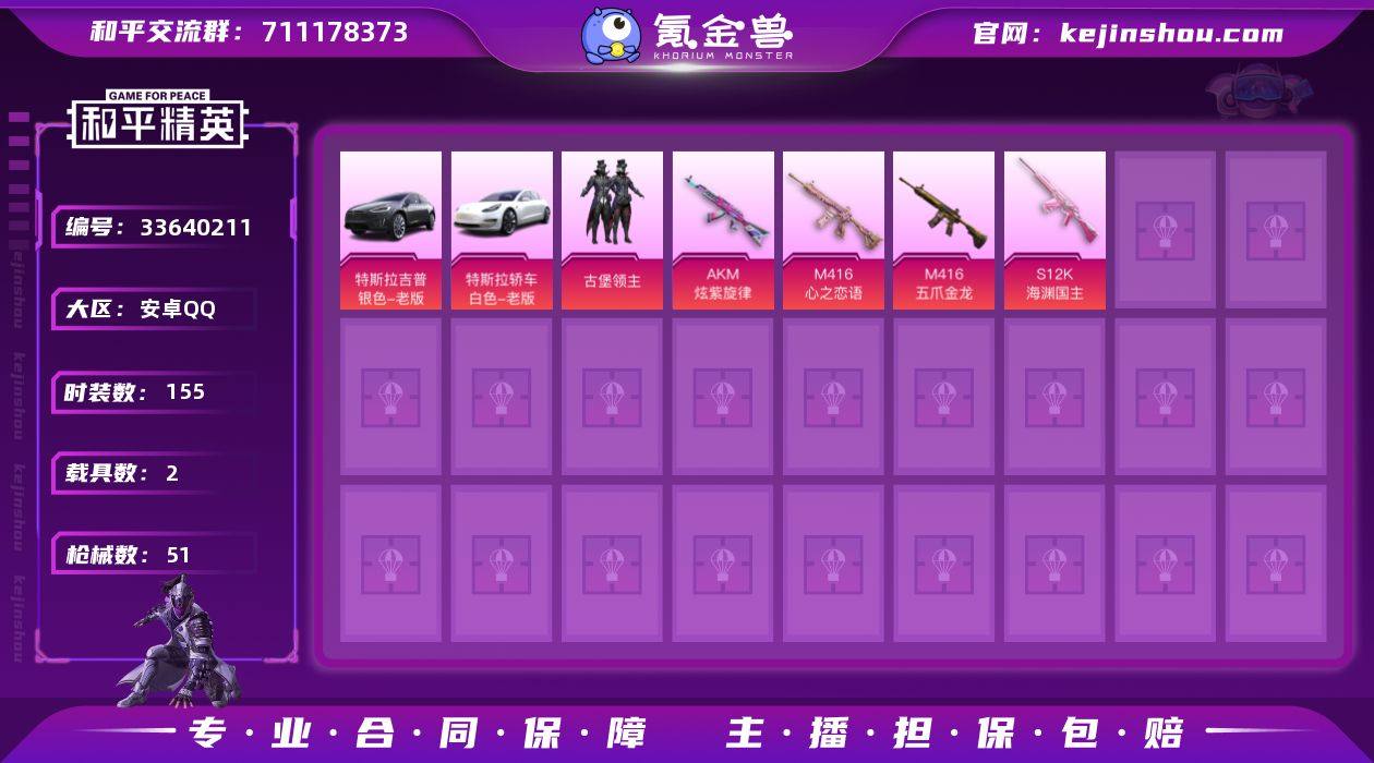 【959220】1粉装 4特效枪 2载具 可二次 可修改实名 【热门装扮】古堡领主,好奇恐龙 【载具】特斯拉Model X(冷光银),特斯拉Model 3(珍珠白) 【稀有枪皮】M416五爪金龙,M416心之恋语,AKM炫紫旋律,S12K海渊国主 【五级特效枪】五级AKM-炫紫旋律 【二级特效枪】二级M416-心之恋语,二级M416-五爪金龙 【一级特效枪】一级S12K-海渊国主 【紫色装扮】活力之心,格斗先锋,凛冬战士,圣诞大吉,甜蜜告白,疯狂小兔子,碟中谍A款,灰色格斗者,牛气满满,SS5特训,冰原使者,霓虹极客,雪山征服者,雪山精英,骑行爱好者,黄色伏地魔,黄色格斗者,SS9特训,舞夜骑士,红酒骑士,风华少年志,白月香洋装,SS10特训,机械征服者,SS11特训,SS17特训,智慧之神,海上生明月,摇滚狂鲨,幻世猎手,摩艾涂鸦,时之沙漏 【优质战备】古堡领主降落伞,飞行器-古堡领主