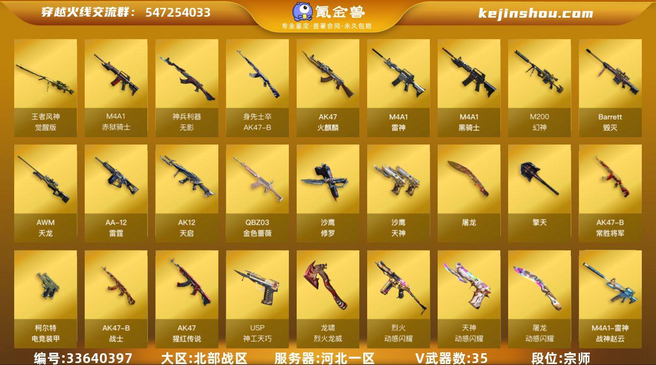 【ky7047】河北一区-42V-7王者武器数-0炫金武器数 【热门武器】:QBZ03-金色蔷薇,M200-幻神,M4A1-黑骑士,羊驼玩偶,沙鹰-修罗 【王者炫金武器】:高爆手雷-雷霆王者*2 【音效卡】:M4A1-黑骑士音效卡 【皮肤】:M200-幻神-黄忠皮肤,幻神-动感闪耀 皮肤,雷神-暗月,M4A1-战神赵云,火麒麟-AG战队皮肤,火麒麟-心动糖果,毁灭-冠军之怒,黑龙-能量核心,无影-能量核心,战神-粉色甜心皮肤,战神-紫绶金章皮肤,战神-流金岁月皮肤,AK47-B-常胜将军-刘备*2,AK47-B-常胜将军-孙权 【角色】:魅影,王者-瞳-闭月羞花,乔伊教练,空,暗夜-X,风暴女,嘉年华灵狐,荆棘玫瑰,灵狐者-X,灵狐者-黄金海岸,灵狐者-七夕宝贝,潘多拉-X,斯沃特-X,兔囡囡,雪莉杨,影武者-X 【人偶武器】:AWM-灵狐-15周年嘉年华,闪光弹-貂蝉,高爆手雷-大乔 【暴走生化】:超级对讲机 【挑战大师】:冰龙粉碎者-白马银枪,激光毁灭者III,神圣爆裂者-末日III*2 【英雄级武器】:AK47-火麒麟*2,M4A1-雷神,M4A1-黑骑士,AK12-天启,QBZ03-金色蔷薇,无影-神兵利器,烈火-动感闪耀,AK-47-猩红传说,AK47-B-常胜将军,AK47-B-身先士卒,AK47-B-战士,AWM-天龙,Barrett-毁灭,M200-幻神,王者风...