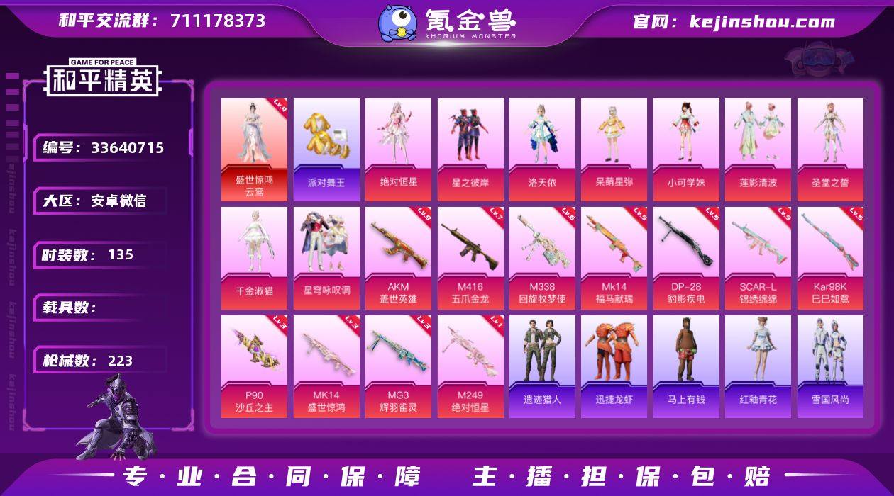 【AZH3614】安卓 微信【四级云鸾 洛天依千金淑猫金靴子 满级盖世英雄AKM 五爪金龙M416】1神装-9粉装-11特效枪-0载具-12粉色飞行器-78059热力值-13王牌印记-135套装-223枪皮 【红色神装等级】:盛世惊鸿-云鸾(四级) 【红色角色神装】:盛世惊鸿-云鸾 【热门品类】:套装-派对舞王,套装-龟仙人,角色-Mark.06,大砍刀-青龙偃月刀 【粉色套装】:角色-绝对恒星,粉装-星之彼岸,角色-洛天依,角色-呆萌星弥,角色-小可学妹,粉装-莲影清波,角色-圣堂之誓,角色-千金淑猫,粉装-星穹咏叹调 【粉色枪皮等级】:AKM-盖世英雄(九级),SCAR-L-锦绣绵绵(五级),M416-五爪金龙(七级),P90-沙丘之主(三级),Kar98K-巳巳如意(五级),Mk14-盛世惊鸿(三级),Mk14-福马献瑞(五级),M249-绝对恒星(一级),DP-28-豹影疾电(五级),MG3-辉羽雀灵(三级),M338-回旋牧梦使(六级) 【粉色枪皮】:AKM-盖世英雄,SCAR-L-锦绣绵绵,M416-五爪金龙,P90-沙丘之主,Kar98K-巳巳如意,Mk14-盛世惊鸿,Mk14-福马献瑞,M249-绝对恒星,DP-28-豹影疾电,MG3-辉羽雀灵,M338-回旋牧梦使 【粉色飞行器】:绝对恒星飞行器,炫彩糖果飞行器,祥瑞起舞飞行器,星之彼岸飞行器,镜域双华-灵镜之阶,曦光华影飞行器...