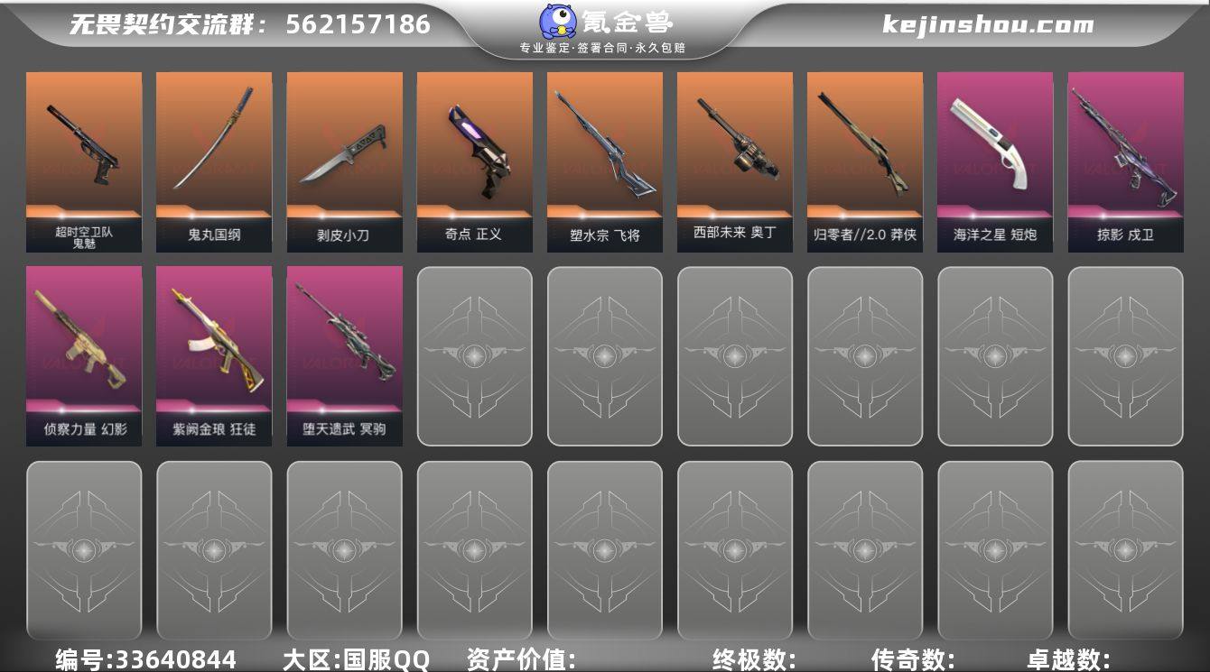 【套装】:VCT 2026 赛季套装 【英雄】:炼狱,维斯,暮蝶,壹决,铁臂,捷风,雷兹,不死鸟,贤者,猎枭,蝰蛇,零,芮娜,尚勃勒,霓虹,K/O,海神,黑梦 【近战武器】:近战武器-蒙太奇 战斧,近战武器-VCT 2026 篆刀,近战武器-剥皮小刀,近战武器-鬼丸国纲,近战武器-阿特拉斯指挥部 甩棍 【狂徒】:狂徒-ORA x 颗秒,狂徒-紫阙金琅 【幻影】:幻影-2022全球冠军赛,幻影-侦察力量,幻影-蒙太奇 【戍卫】:戍卫-掠影 【冥驹】:冥驹-堕天遗武 【飞将】:飞将-塑水宗 【莽侠】:莽侠-归零者//2.0 【战神】:战神-蒙太奇 【奥丁】:奥丁-西部未来 【判官】:判官-神罚 【雄鹿】:雄鹿-紫阙金琅//2.0 【骇灵】:骇灵-无限竞技,骇灵-蒙太奇 【VCT手枪】:标配-VCT26 x GX 【正义】:正义-奇点 【鬼魅】:鬼魅-超时空卫队 【狂怒】:狂怒-蒙太奇 【短炮】:短炮-海洋之星 【卡面】:热舞环节 卡面,生意人麦宝 卡面,树懒大作战 卡面,红鳞松叶 卡面,Clutch 卡面,战术小伙伴的夏日 卡面,无畏契约GO!第一卷:芮娜 卡面,无畏契约GO!第一卷:零 卡面,无垠星环 卡面,《双城之战》金克丝 卡面,钢锁vs盖可 卡面,代号红色 卡面,新兵报到 卡面,V契约 卡面,无畏契约 卡面...