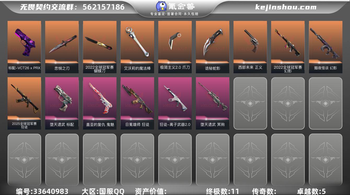 【PTWW3876】LV等级74/皮肤总价值32280/段位青铜/总皮肤数量45/刀皮数量5/枪皮数量40/套装数量3/具体详情请看图/2022全球冠军赛/无畏契约季前邀请赛套装/极简主义//2.0套装/幻棱/炼狱/暮蝶/壹决/捷风/雷兹/幽影/不死鸟/贤者/猎枭/芮娜/尚勃勒/霓虹/夜露/K/O/盖可/黑梦/蝴蝶刀-2022全球冠军赛/无畏契约季前邀请赛 悲悯之刃/艾沃莉的魔法棒/极简主义2.0 爪刀/诡秘蛇影/2025全球冠军赛 狂徒/狂徒-日冕雄师/狂徒-离子武器2.0/狂徒-诡秘蛇影/狂徒-极简主义//2.0/幻影-2022全球冠军赛/幻影-黯夜怪谈/幻影-末日之翼/戍卫-折光棱晶/獠犬-极简主义//2.0/冥驹-堕天遗武/飞将-极简主义//2.0/飞将-末日之翼/莽侠-诡秘蛇影/奥丁-末日之翼/判官-诡秘蛇影/蜂刺-折光棱晶/标配-堕天遗武/标配-折光棱晶/标配-VCT26 x PRX/正义-西部未来/鬼魅-盖亚的复仇/鬼魅-诡秘蛇影/鬼魅-极简主义//2.0/狂怒-万花棱镜/短炮-末日之翼/热舞环节 卡面/树懒大作战 卡面/Clutch 卡面/无畏契约GO!第一卷:芮娜 卡面/无畏契约GO!第一卷:零 卡面/无垠星环 卡面/无畏契约GO!第一卷:贤者 卡面/钢锁vs盖可 卡面/代号红色 卡面/新兵报到 卡面/V契约 卡面/无畏契约 卡面/审判之爪 喷漆/霓光四射 喷漆/双人比心 喷漆/...