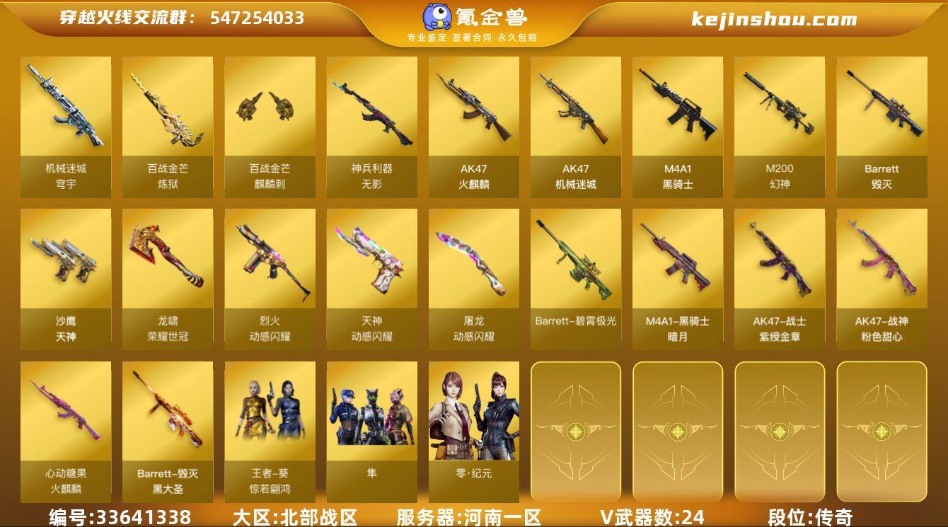 【ky6620】河南一区-25V-0王者武器数-0炫金武器数 【热门武器】:M200-幻神,M4A1-黑骑士,荣耀世冠-龙啸 【音效卡】:天神-动感闪耀 音效卡,炼狱-百战金芒-庆典舞曲音效卡 【皮肤】:M4A1-再燃火线,雷神-神秘按键 皮肤,火麒麟-心动糖果,毁灭-黑大圣皮肤,黑骑士-暗月,战神-粉色甜心皮肤,战神-紫绶金章皮肤,轻型军用手斧-再燃火线 【角色】:隼,零·纪元,王者葵-惊若翩鸿,乔伊教练,葵-阿尔法武装,芳心审判者,风暴女,嘉年华灵狐,荆棘玫瑰,潘多拉-X,青霞仙子,斯沃特-X,潘多拉-N 【人偶武器】:M4A1-雷神-精英刀锋,AWM-灵狐-15周年嘉年华,迷你生化手雷,迷你超能女侍 【暴走生化】:超级对讲机 【挑战大师】:激光毁灭者III-白马银枪*2,神圣爆裂者-末日III 【英雄级武器】:AK47-火麒麟,M4A1-黑骑士,AK47-机械迷城,无影-神兵利器,烈火-动感闪耀,机械迷城-穹宇,Barrett-毁灭,M200-幻神,Barrett-金色蔷薇,炼狱-百战金芒,沙鹰-天神,天神-动感闪耀,屠龙-动感闪耀,荣耀世冠-龙啸,麒麟刺-百战金芒,丛林匕首-玄豹,高爆手雷-幻灵,手雷-动感闪耀,闪光弹-幻灵,烟雾弹-幻灵,烟雾弹-玄豹,Barrett-碧霄极光 【其他武器】:源·火麒麟*2,AK47-火麒麟...