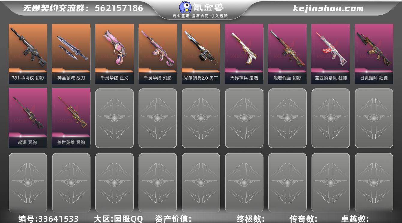 【套装】:2025全球冠军赛套装,千灵华绽//2.0套装 【英雄】:幻棱,炼狱,维斯,暮蝶,钛狐,壹决,铁臂,捷风,雷兹,幽影,不死鸟,贤者,猎枭,蝰蛇,零,芮娜,奇乐,尚勃勒,霓虹,斯凯,夜露,星礈,K/O,海神,盖可,黑梦,钢锁 【近战武器】:近战武器-2025全球冠军赛 蝴蝶刀,近战武器-蒙太奇 战斧,近战武器-碎心裂刃,近战武器-流风回雪,近战武器-诡秘蛇影 军刀,近战武器-神圣领域 战刀 【狂徒】:狂徒-2025全球冠军赛,狂徒-千灵华绽//2.0,狂徒-超时空卫队,狂徒-盖亚的复仇,狂徒-日冕雄师,狂徒-耀鳞威龙,狂徒-诡秘蛇影 【幻影】:幻影-千灵华绽,幻影-781-A协议,幻影-般若假面,幻影-神圣领域,幻影-蒙太奇,幻影-末日之翼 【戍卫】:戍卫-月球哨兵,戍卫-折光棱晶 【獠犬】:獠犬-神圣领域 【冥驹】:冥驹-盖世英雄,冥驹-起源,冥驹-星云暗涌 【飞将】:飞将-末日之翼 【莽侠】:莽侠-千灵华绽//2.0,莽侠-诡秘蛇影,莽侠-月球哨兵 【战神】:战神-千灵华绽//2.0,战神-神圣领域,战神-蒙太奇 【奥丁】:奥丁-光明哨兵//2.0,奥丁-末日之翼 【判官】:判官-诡秘蛇影 【雄鹿】:雄鹿-月球哨兵 【骇灵】:骇灵-无限竞技,骇灵-蒙太奇,骇灵-星云暗涌 【...