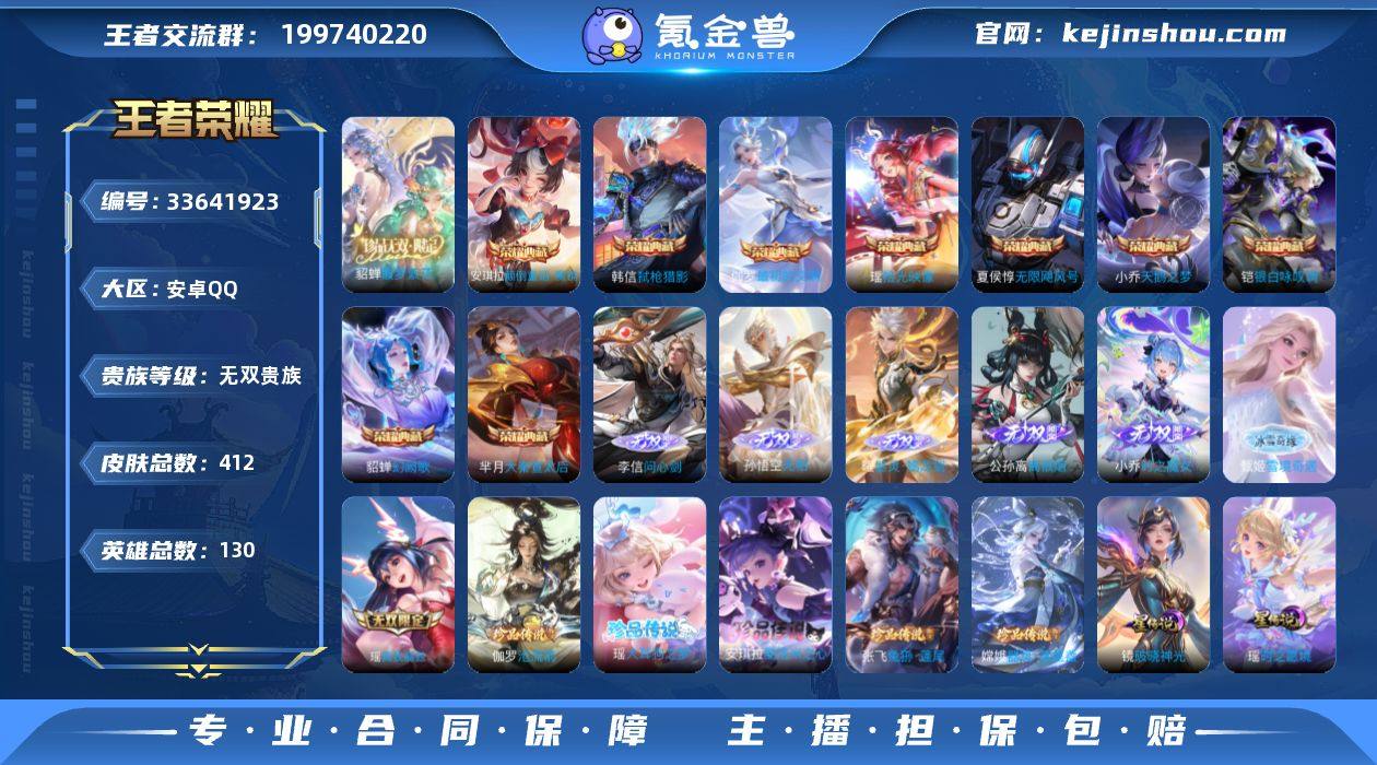 瑶全皮!无双V10!18万流光积分! 国标芈月!安卓Q-412皮肤-9典藏皮肤--1珍品无双-7无双-5珍品传说-70传说-109史诗 【英雄全皮】:孙权全皮,瑶全皮,亚连全皮,敖隐全皮,夏洛特全皮,莱西奥全皮,空空儿全皮,影全皮,海诺全皮 【荣耀典藏】:武则天英雄,夏侯惇无限飓风号,小乔天鹅之梦,芈月大秦宣太后,铠银白咏叹调,貂蝉幻阙歌,韩信弑枪猎影,瑶拾光映像,伽罗最初的交响,安琪拉颠倒童话魔镜 【珍品无双】:貂蝉馥梦繁花 【无双皮肤】:李信问心剑,孙悟空无相,曜器灵螭龙剑,甄姬雪境奇遇,公孙离离恨烟,小乔时之魔女,瑶真我赫兹 【珍品传说】:伽罗沧流箭,安琪拉酷洛米之心,瑶大耳狗之梦,张飞兔狲蓬尾,嫦娥器灵落星盏 【传说皮肤】:云缨神骥越千峰,关羽神骥镇沧海,朵莉亚神骥鸣幻洲,狄仁杰神骥赴朔漠,貂蝉神骥聚万邦,马超神骥逐星野,花木兰异界灵契,公孙离云诺千山,西施续相思,后羿千劫归真,司空震愿照山河定,女娲愿照千秋盛,妲己愿照众生和,澜愿照九州拓,蔡文姬愿照福禄聚,虞姬愿照岁时盈,云缨幻光神枪,裴擒虎祥瑞亨通,嬴政玄雷天君,王昭君映山客,桑启鸣野蒿,庄周牧神诗旅,海月金乌负日,亚连落雪白狼,典韦战鼓燎原,赵云乘龙铭...