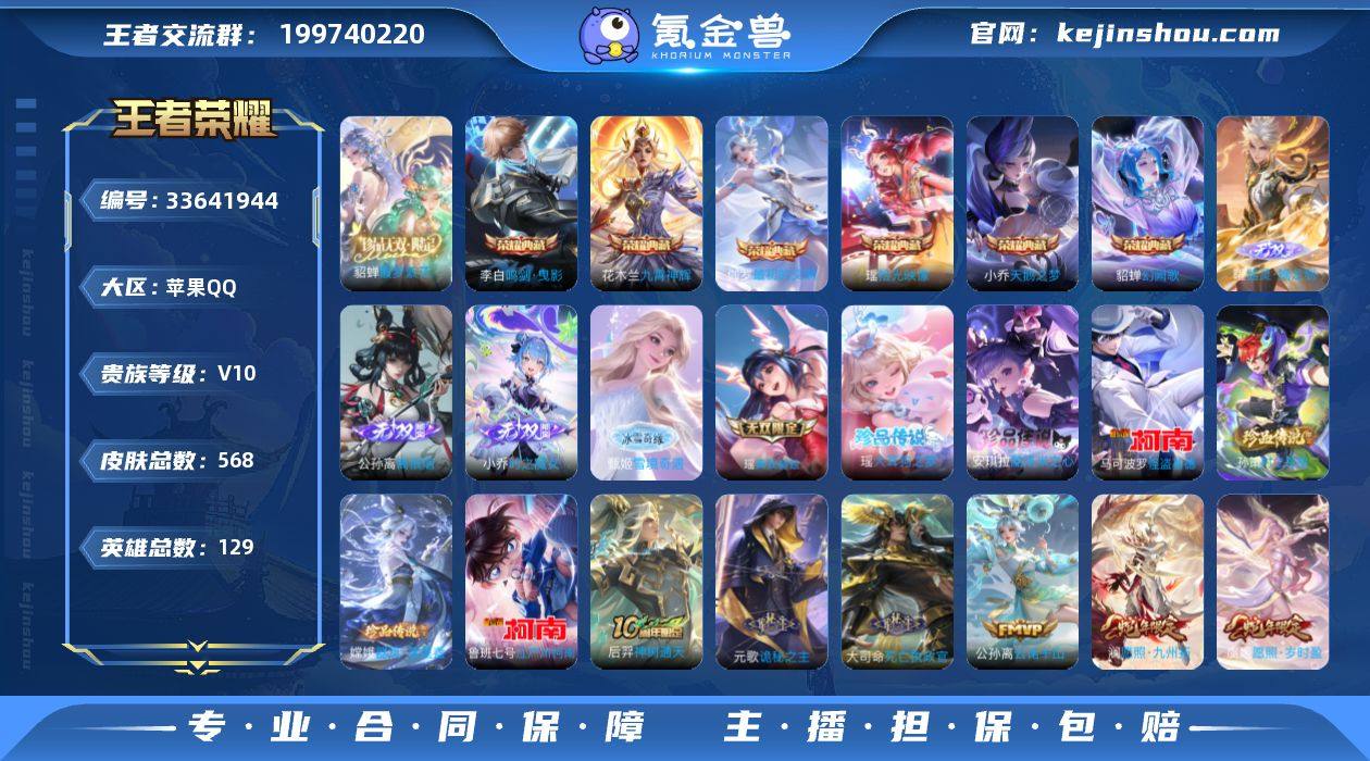 实名: 可修改 性别: 女号 贵族等级: V10 英雄数: 129 皮肤数: 568 荣耀水晶: 天鹅之梦,鸣剑·曳影,九霄神辉,幻阙歌,拾光映像,最初的交响 无双皮: 真我赫兹(瑶),小乔时之魔女,离恨烟,雪境奇遇-甄姬,器灵·螭龙剑 珍品传说: 江户川柯南,怪盗基德,时之奇旅-孙策,器灵·落星盏,酷洛米之心,大耳狗之梦 传说皮: 黄金射手座,冠军飞将,云鹰飞将,绛天战甲,黄金白羊座,猫影幻舞,久胜战神,炽阳神光,一念神魔,云霓雀翎,末日机甲-孙尚香,仲夏夜之梦,音你心动-小乔,零号·赤焰,地狱之眼,飞鸢探春,音你心动-周瑜,胖达荣荣,乞巧织情,时之恋人-刘备,游龙清影,淬星耀世,超时空战士-狄仁杰,遇见胡旋,花朝如约,挚爱之约,挚爱花嫁,山海·炽霜斩,山海·琳琅生,山海·苍雷引,炽翼辉光,燃星之曲,画中仙,浮生妄,记忆之芯,追逃游戏(安琪拉),妄想实况,妄想奇谈,鹤归松栖(云缨),鲁班七号-时之奇旅,大乔-时之奇旅,小动物乐团,霜月吟,澜逐花归海,艾琳觅芳踪,乘龙·问璇玑,乘龙·铭钟鼎,乘龙·淬吴钩,貂蝉曦玄引,落雪白狼,金乌负日,朵莉亚心动手记,牧神诗旅,玄雷天君,幻光神枪,星之鸣奏,千劫归真,续相思,云诺千山,死亡执政官,诡秘之主,神树通天 限定皮: 遇见飞天,李小龙,祈雪灵祝,游园惊梦,梁祝,御风骁将,时雨天司,龙胆,...