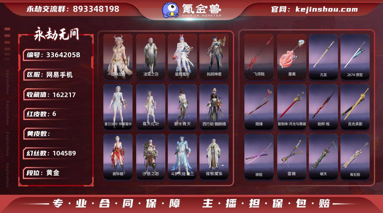 【红皮】:墨离(飞索皮肤),凌霄之羽(无尘皮肤),泣珠龙纱(崔三娘皮肤),飞将戟(斩马刀皮肤),执明神君(魏轻皮肤),星辉魔纱(沈妙皮肤) 【外观总数】7红 218金 幻丝:146218金砖: 收藏值:15W 【换绑】:可换绑,期间登录网易大神不影响正常游戏,其他皮肤可参考以下截图,道具、段位以实际验号为准,段位因赛季原因发生变化,以上号为准"