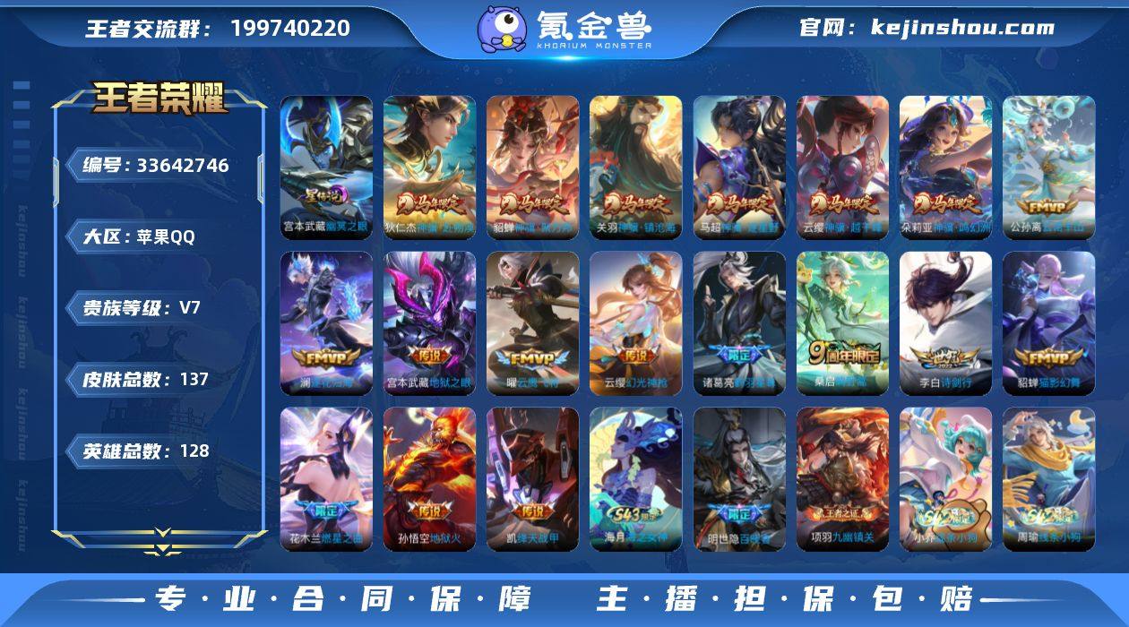 捡漏小号,19按键,2星传说 苹果Q-V7-永恒钻石II段位-128英雄-137皮肤-18传说-38史诗 【英雄全皮】:孙权全皮,敖隐全皮 【传说皮肤】:云缨神骥越千峰,关羽神骥镇沧海,朵莉亚神骥鸣幻洲,狄仁杰神骥赴朔漠,貂蝉神骥聚万邦,马超神骥逐星野,公孙离云诺千山,云缨幻光神枪,桑启鸣野蒿,澜逐花归海,诸葛亮鹤羽星尊,花木兰燃星之曲,李白诗剑行,铠绛天战甲,曜云鹰飞将,貂蝉猫影幻舞,宫本武藏地狱之眼,孙悟空地狱火 【限定皮肤】:李白谪仙醉月,狄仁杰阴阳师,赵云皇家上将,孙尚香蔷薇恋人,元歌无心,狄仁杰魔术师,达摩沙漠行僧,项羽海滩派对,兰陵王金庭之子,花木兰燃星之曲,李元芳云中旅人,鬼谷子五谷丰年,诸葛亮鹤羽星尊,沈梦溪大漠名商,裴擒虎李小龙,裴擒虎擒涛扼浪,上官婉儿神器万象笔,鲁班大师探海日志,桑启海盐诗旅,张良古海寻踪,沈梦溪龙舞盛年 【赛季限定】:达摩沙漠行僧,兰陵王金庭之子,沈梦溪大漠名商,李元芳云中旅人,桑启海盐诗旅,裴擒虎擒涛扼浪,鲁班大师探海日志,张良古海寻踪,东皇太一噬灭天穹,太乙真人谧流熔炉,钟馗虚灵犬护,甄姬逆浪荇歌,亚瑟荣光之誓,项羽九幽镇关 【战令限定】:百里守约百相守梦,老夫子百相守梦...