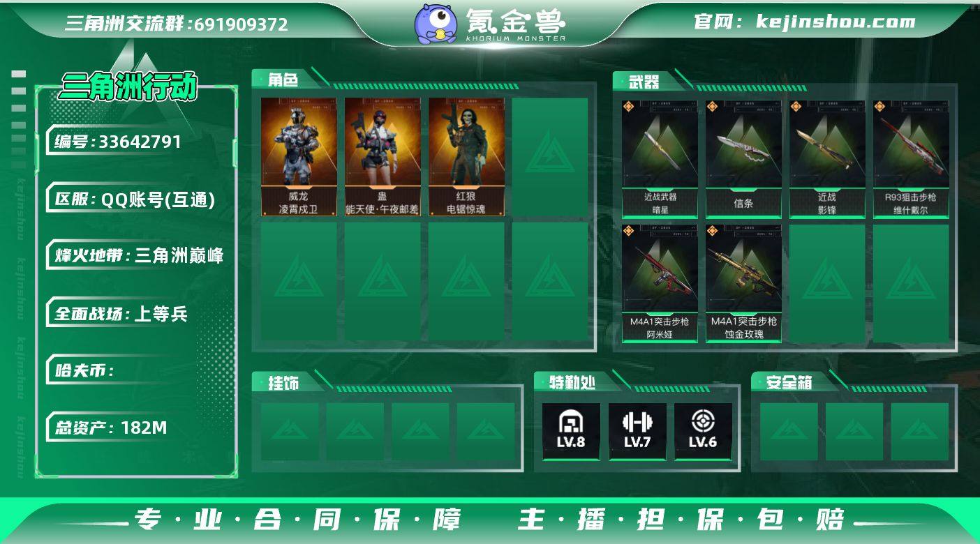 总资产:182.8M 3干员外观 3近战传说 30传说枪械 哈夫币:11.581K 可二次 可修改实名 【烽火地带段位】三角洲巅峰 【全面战场段位】上等兵 【干员外观】威龙-凌霄戍卫,蛊-能天使·午夜邮差,红狼-电锯惊魂 【传说武器皮肤】近战武器-暗星,近战-信条,近战-赤枭,M7战斗步枪-棱镜攻势S2(典藏),SG552突击步枪-运动员,SR-25射手步枪-信条,P90冲锋枪-信条,M250通用机枪-骑士之心,R93狙击步枪-维什戴尔,SCAR-H战斗步枪-启航,ASh-12战斗步枪-鹅鸭杀,QCQ171冲锋枪-鹅鸭杀,QJB201轻机枪-鹅鸭杀,M250通用机枪-几何解构,KC17突击步枪-电锯惊魂,SKS射手步枪-骑士,47突击步枪-悠然茶歇,AUG突击步枪-悠然茶歇,UZI冲锋枪-悠然茶歇,M14射手步枪-缄花,腾龙突击步枪-马年祥瑞,47突击步枪-暗星,SR-3M紧凑突击步枪-暗星,M14射手步枪-蛮荒,K416突击步枪-行动记录,G18-马年祥瑞,SR-25射手步枪-缄花,.357左轮-缄花,M4A1突击步枪-蚀金玫瑰,M4A1突击步枪-阿米娅
